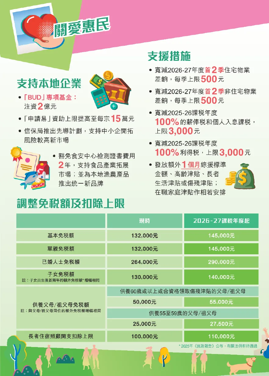 住宅与非住宅物业:宽减2026-27年度首两季的差饷。 每季上限:500港元,即全年最高可节省2,000港元。 适用场景:无论是公司在港的办公地址、注册地址,还是用于仓储的物业,均可享受此项宽减。企业主在收到差饷单时,请注意核对自动扣减的金额。