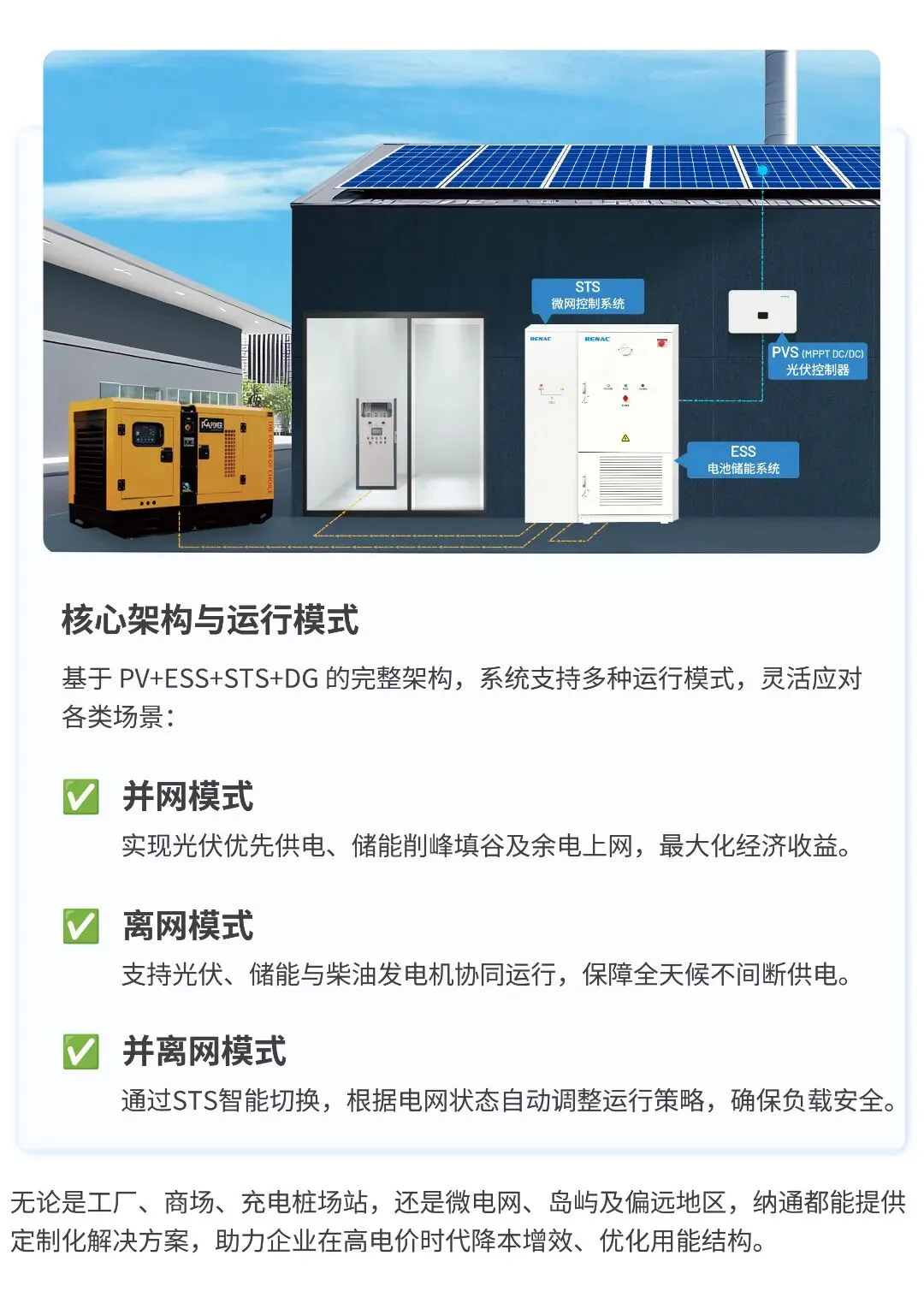 面对工商业用户对电价波动与电网压力的双重挑战,纳通能源推出 RENA5000 C&I ESS 解决方案,提供高效、可靠、智能的一站式服务。