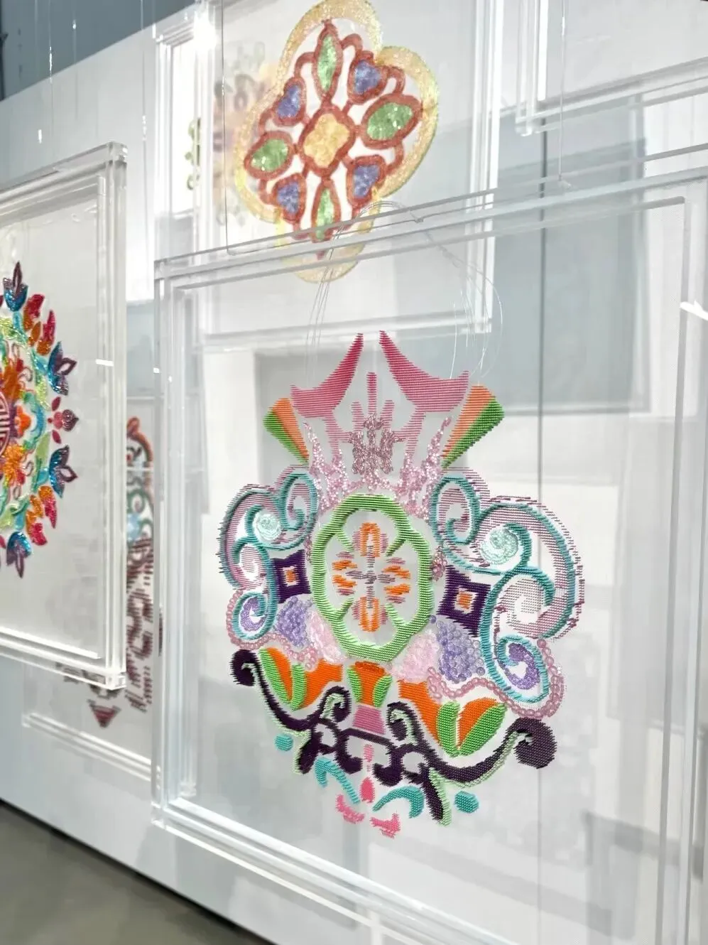 同时,展区特别引入三位独立设计师携作品助阵,与企业并肩呈现:纺织艺术家虞师菁(JILLYU)携作品《挪威森林》,以多元纤维材质诠释对生活的细腻感悟;纺织艺术家陈诺(CN)带来作品《备菜》,以日常厨具与毛线交织,传递家庭温情;徐诗妤则用《绣缕藏窗》,以3D打印与刺绣结合重现传统漏窗美学。各位设计师与数十家入驻企业携手,通过沉浸式场景搭建、前瞻趋势解读,结合企业实操案例与设计师人文表达,为行业提供可落地、可借鉴的潮流路书与战略决策参考。