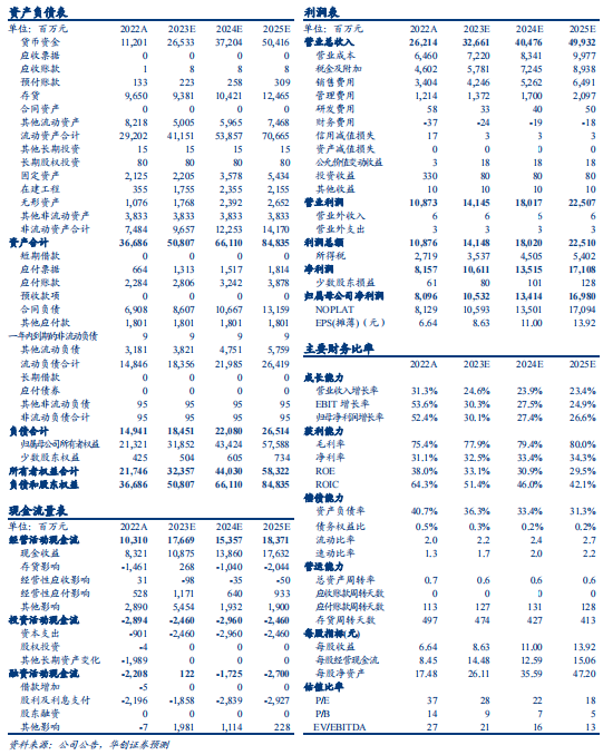 公司发布2022年报及2023年一季报,22年实现营收262.1亿元,同增31.3%,归母净利润81.0亿元,同增52.4%。其中Q4收入40.7亿元,同增50.0%,归母净利润9.9亿元,同增127.1%。23Q1实现营收126.8亿元,同增20.4%,归母净利润48.2亿元,同增29.9%。23Q1销售回款98.2亿元,同增10.7%,Q1末合同负债41.7亿元。