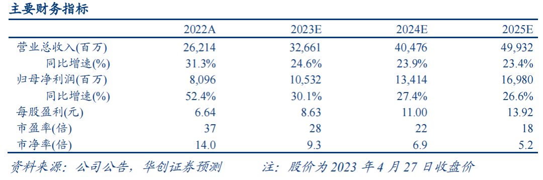 压制疑云有望逐渐消散,估值性价比凸显,维持“强推”评级。公司Q1业绩超预期兑现,Q2低基数下弹性有望更优。同时公司管理层保持务实拼搏状态,4月起控货挺价措施落地,后续批价和库存等指标有望改善,压制疑云有望逐渐消散。公司目前估值已回落至28倍,对应24年22倍,性价比凸显。结合最新运营情况,我们预计23-25年EPS为8.63/11.00/13.92元(原23-24年预测值为8.72/11.16元),维持目标价350元,维持“强推”评级。