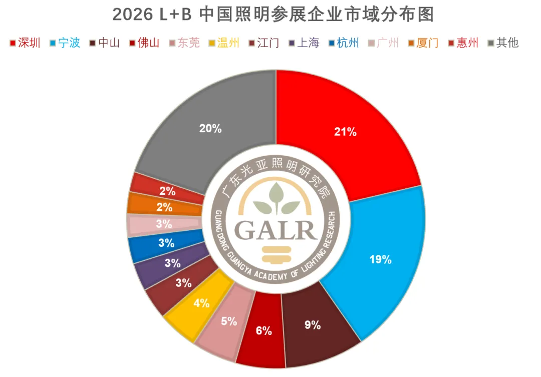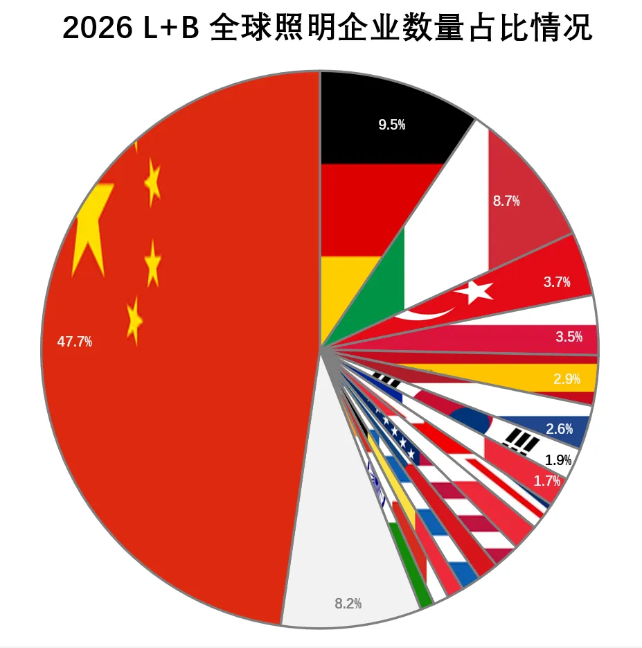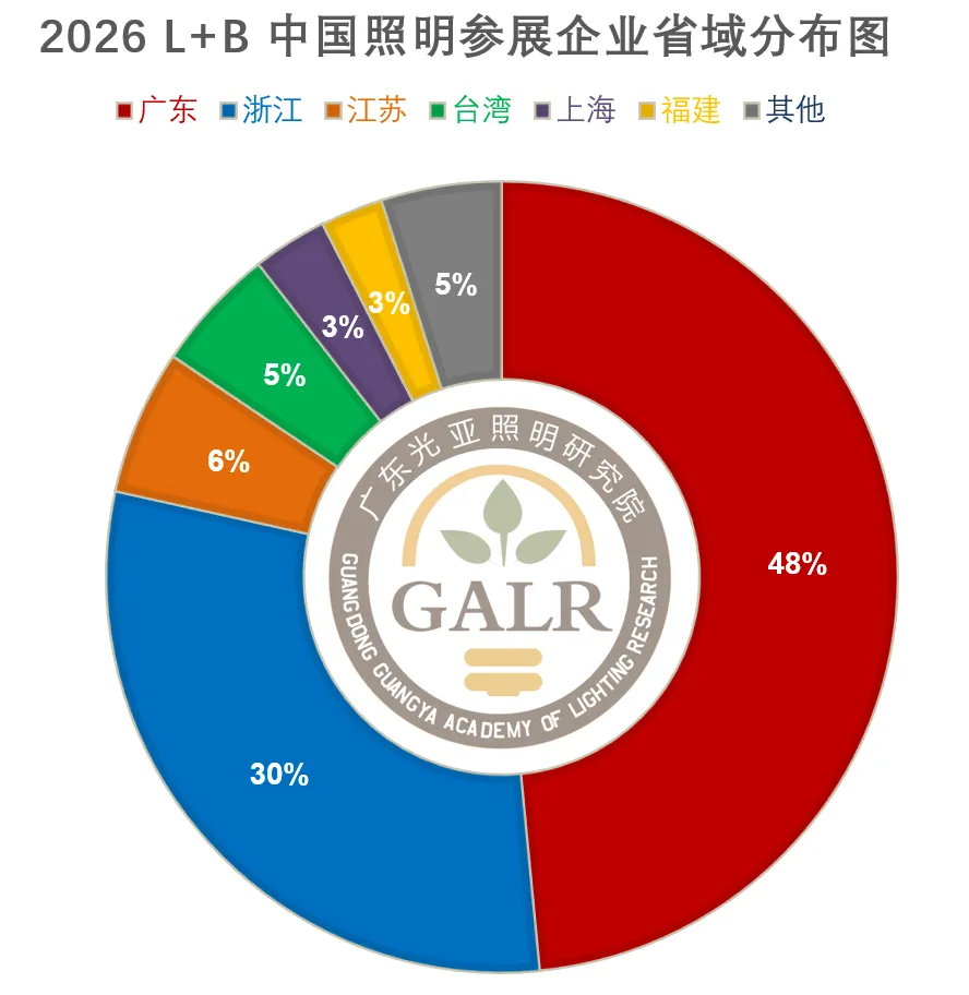在中国参展企业中,照明成品企业占比近九成;驱动电源、调光器、控制系统、LED 封装、透镜 / 反射器、开关 / 插座、连接器、线路板、板材 / 型材 / 压铸件及生产设备等配套企业约占10%。