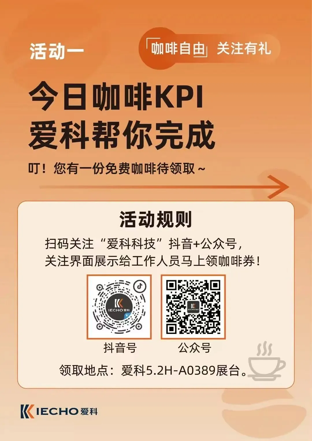 现场扫码关注「爱科科技」抖音号+公众号,即可领取免费咖啡券,享受一杯醇香咖啡,为观展补充能量。