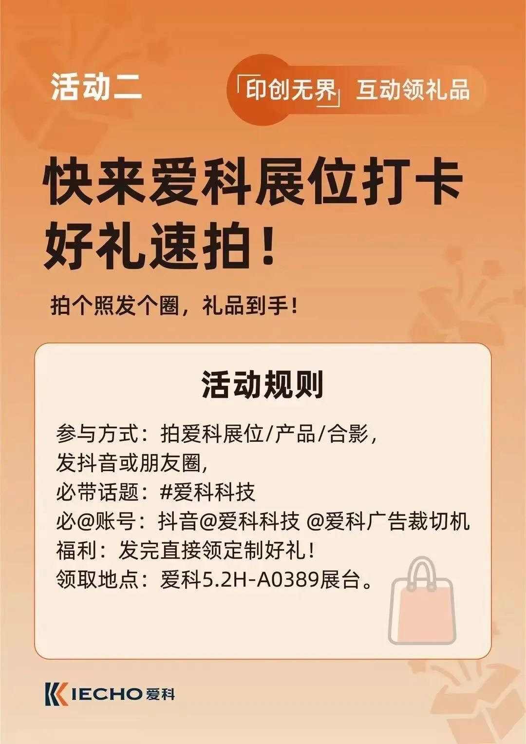 拍摄爱科展位、产品或合影,发布至抖音或朋友圈,必带话题#爱科科技,抖音、视频号需@爱科科技@爱科广告裁切机,发布成功后,即可现场领取爱科定制好礼。