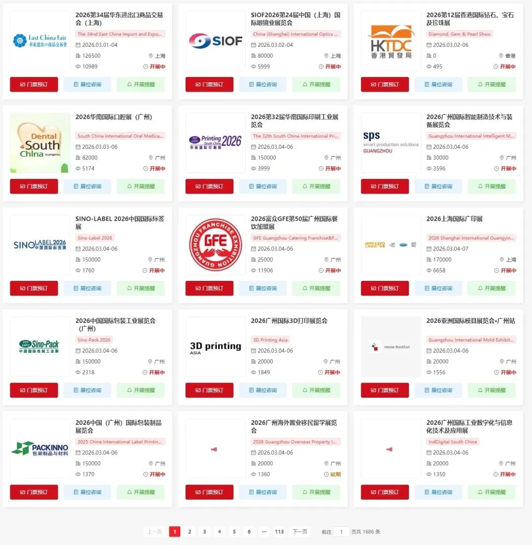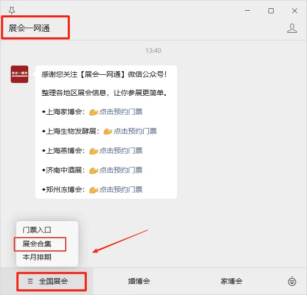 关注【展会一网通】微信公众号,在聊天对话框内点击底部菜单栏【全国展会】查看全国最新展会信息、门票预约入口