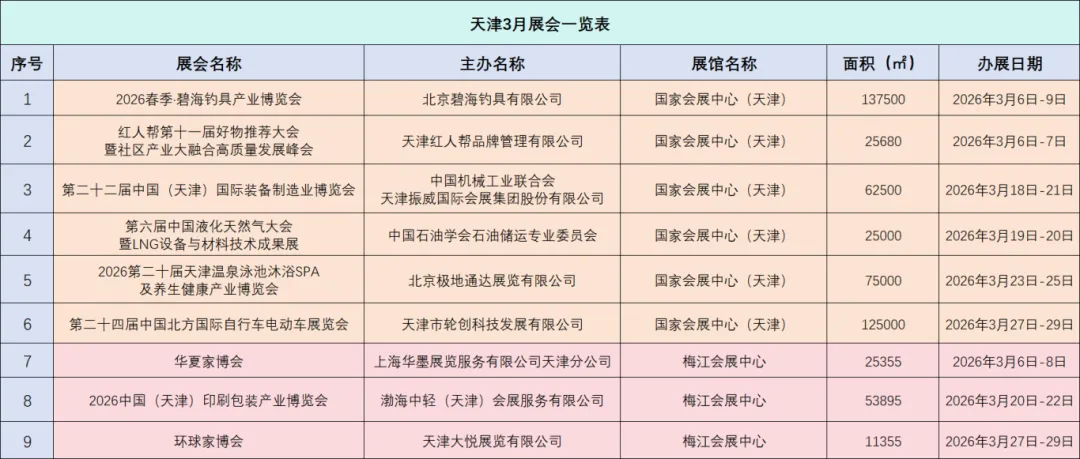 2026年3月份,国家会展中心(天津)、梅江会展中心将举办展会活动9场。主要展会活动内容预报如下: