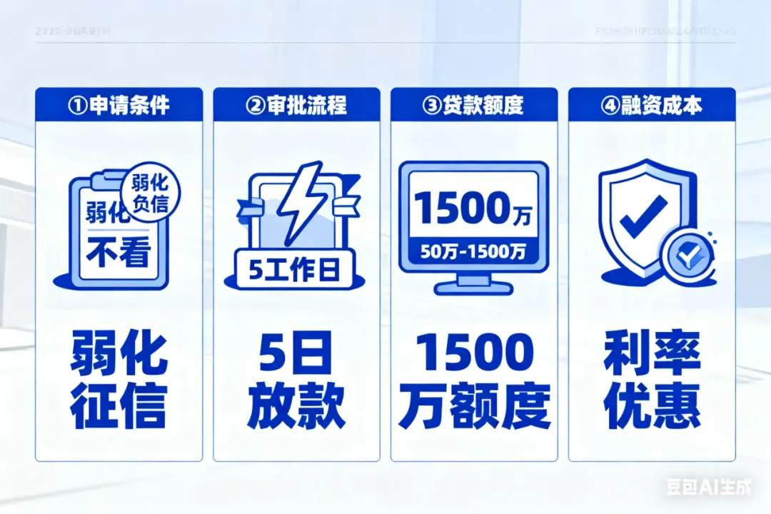 1. 申请条件极致简化:“弱化征信,不看负债” 本次信用贷款产品实现了革命性突破。银行审批重点聚焦企业自身的经营健康状况,大幅弱化了对企业负债和法人征信的严苛要求。企业主无需再为复杂的负债证明和微瑕的征信记录而焦虑。