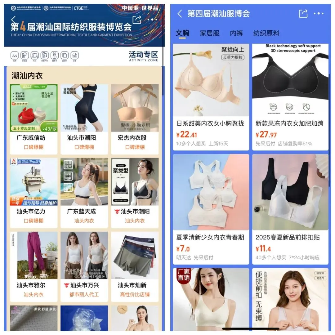 打造“买全球,卖全球”电商平台对接一条街、举办“内衣行业电商布局趋势论坛”、携手会员企业打造首个行业类垂直类智能体“潮汕非遗新衣橱”、与京东开展2025年产业带共建计划、联合1688上线服博会活动专区等“线上+线下”联动方式,扶持汕头产业带商家,高效赋能汕头纺织服装企业布局电商销售渠道,共组织19家电商平台,邀请近千名精准采购商与卖家现场采购对接,助推汕货产业卖全球。