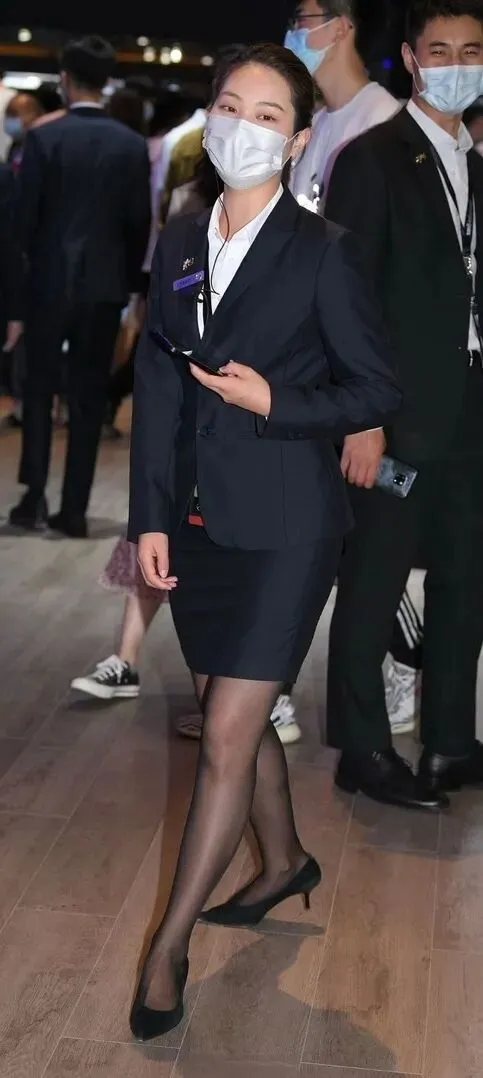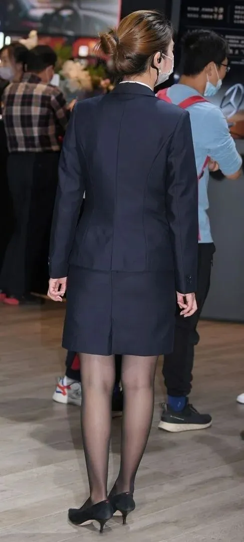 她站在展厅中央,藏青色的西装外套剪裁得恰到好处,腰线收得利落,整个人显得既挺拔又不过分严肃。白色翻领衬衫从领口探出一小截,像是在沉稳中偷偷藏了一丝活泼。最让人挪不开眼的,是那条及膝的半裙,配上薄薄的黑色丝袜,让职业装也多了一份女性特有的柔美。