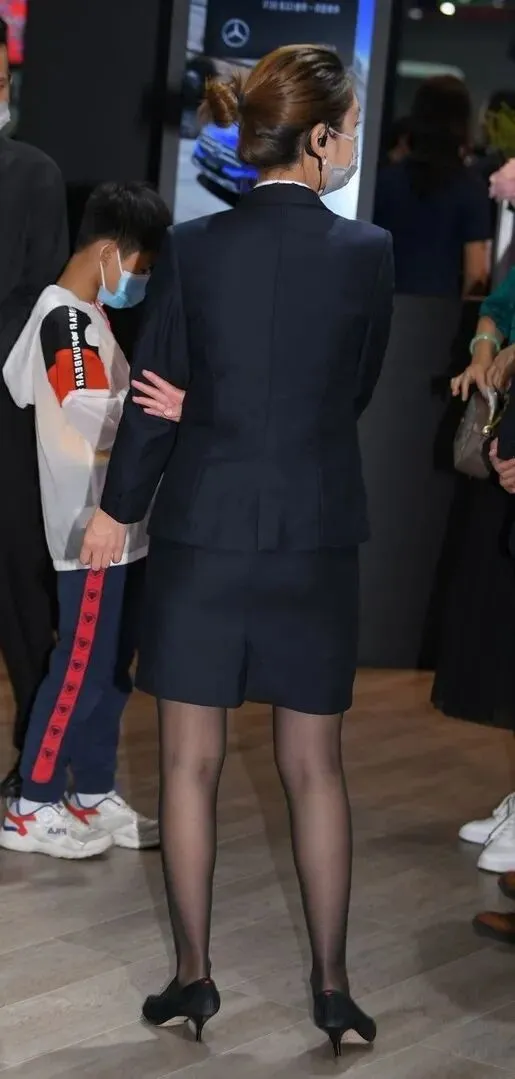 转身的时候,她的背影比正面更有故事感。藏蓝色的西装裙在身后划出优雅的弧度,高跟鞋的鞋跟细细长长的,每走一步都带着节奏感。她左手上搭着一部手机,随时准备着什么,却又保持着一种恰到好处的松弛。