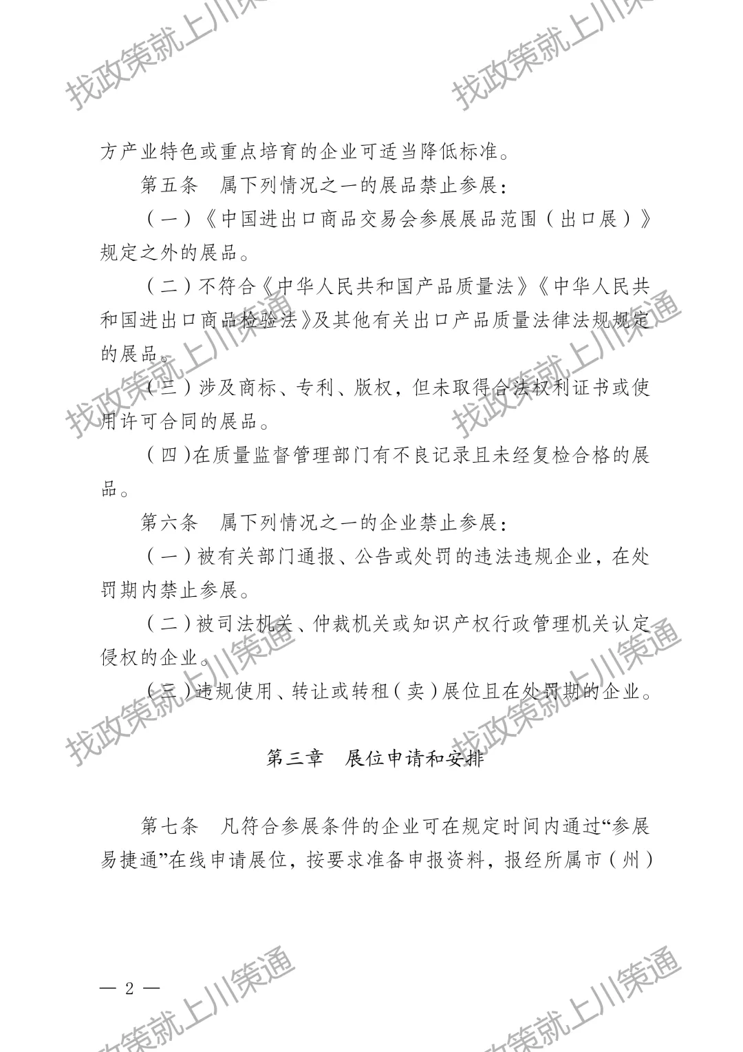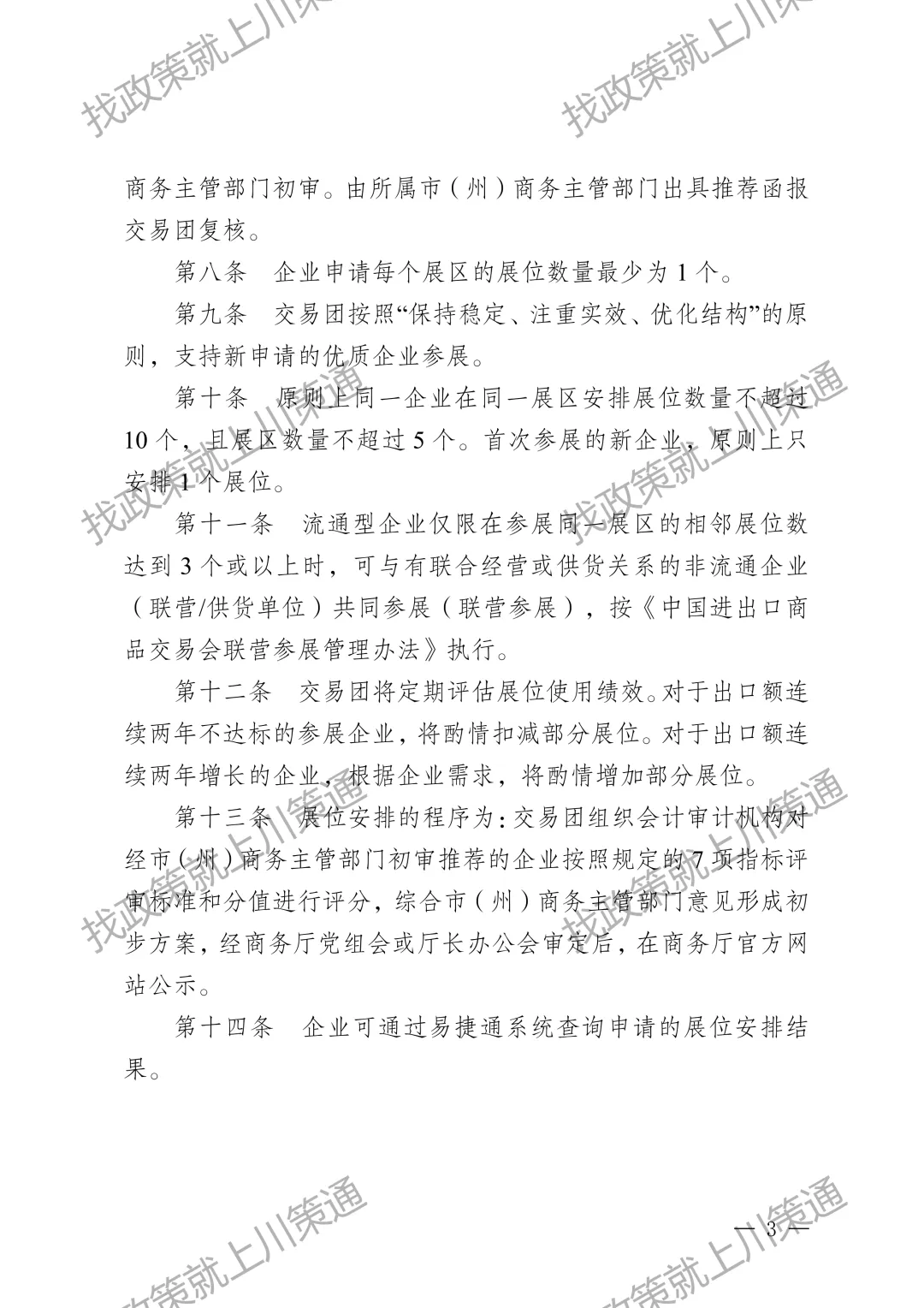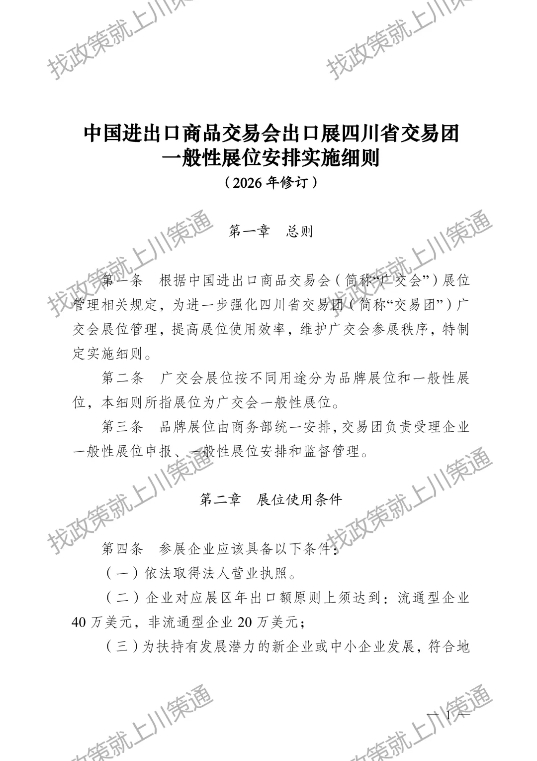 为帮助企业用好用活广交会平台,维护良好展会秩序,提升企业参展绩效,更好促进四川外贸稳量提质。结合近年来展位使用管理的实际情况,现将新修订的《中国进出口商品交易会出口展四川省交易团一般性展位安排实施细则》印发给你们,请遵照执行。