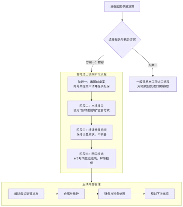 1. 与货代/报关行确认方案:委托有经验的国际货运代理或报关行,告知需求“设备参加国外展会,结束后需原样运回”。2. 准备“暂时进出境”申请:向主管地海关提交《货物暂时进/出境申请批准书》及相关文件。3. 办理担保:提供保证金、银行或保险公司保函等形式的担保。4. 出口报关:使用监管方式代码“2600 暂时进出境货物”进行报关。设备在境外必须保持原状,不得销售、租赁、抵押或移作他用。保留好所有在展会的使用记录、照片等,以备海关后续核查。与货代安排回程运输。通知国内报关行准备复运进境的报关资料。5. 复运进境报关:使用监管方式代码“2600 暂时进出境货物”进行进口报关,提供原出口报关单号。7. 担保解除:凭《货物暂时进/出境核销联系单》办理担保解除手续。8. 流程完结:整个“暂时进出境”监管流程正式结束。入库与检查:设备运回后,立即入库,并进行全面检查和维护,记录其状态。仓储:妥善保管,为下次使用或出境做好准备。会计处理:资产始终在公司账上,出国参展期间正常计提折旧。相关费用计入当期费用。税务处理:不涉及进口关税和增值税的缴纳与抵扣,确保相关费用的发票合规即可。如果该设备未来还会出国参加其他展会或活动,可以借鉴本次流程,提前规划。保留本次所有的报关单、核销单、运输单据等,作为未来类似业务的参考和资质证明。绝对禁止在国外销售:一旦在境外销售,就构成了“一般贸易出口”,需要按出口处理,且无法核销原来的暂时进出境申请,可能导致保证金被罚没,并面临海关处罚。严格遵守期限:务必在海关批准的期限内(通常为出境之日起6个月内)将货物运回。如需延期,必须在期满前向海关提出书面申请。保持货物原状:设备不能有实质性改变。如果因维修更换了零件,需要向海关申报,可能会涉及部分税费。选择专业服务商:强烈建议委托经验丰富的报关行或货代全程操作,他们熟悉流程、能高效处理文件,并提前规避风险。 对于出国参展并需返回的设备,首选“暂时进出境”方式报关。核心步骤是:出国前向海关申请并提供担保 -> 按“暂时进出境”方式报关出口 -> 在国外确保设备不被销售 -> 按期原状运回 -> 复运进境报关并解除担保。 这样操作既能满足参展需求,又能合法合规地节省大量税费成本。