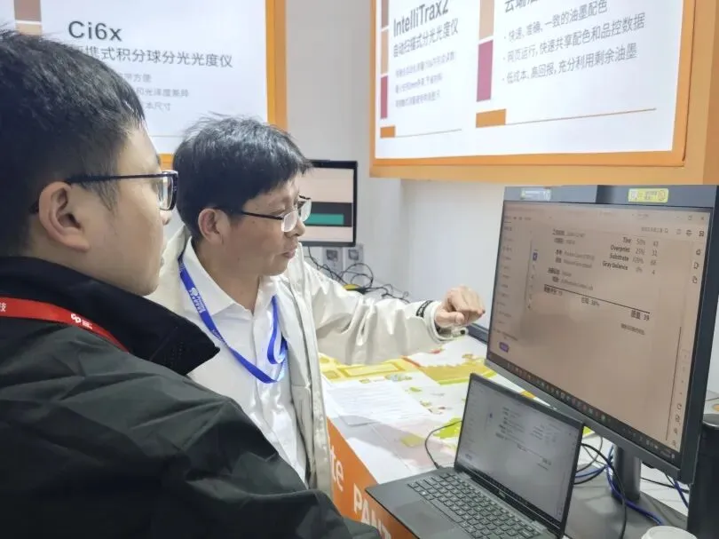 展会现场,爱色丽技术团队通过生动的实操演示和一对一的深度讲解,向参观者直观展示了如何借助数字化工具提升生产效率与产品质量。许多标签印刷企业代表对MeasureColor印刷质量控制软件的实时数据监控功能以及Autura云端油墨配色系统的快速、精准配色能力表现出浓厚兴趣,并就实际生产中的技术难点与爱色丽工程师进行了深入探讨。