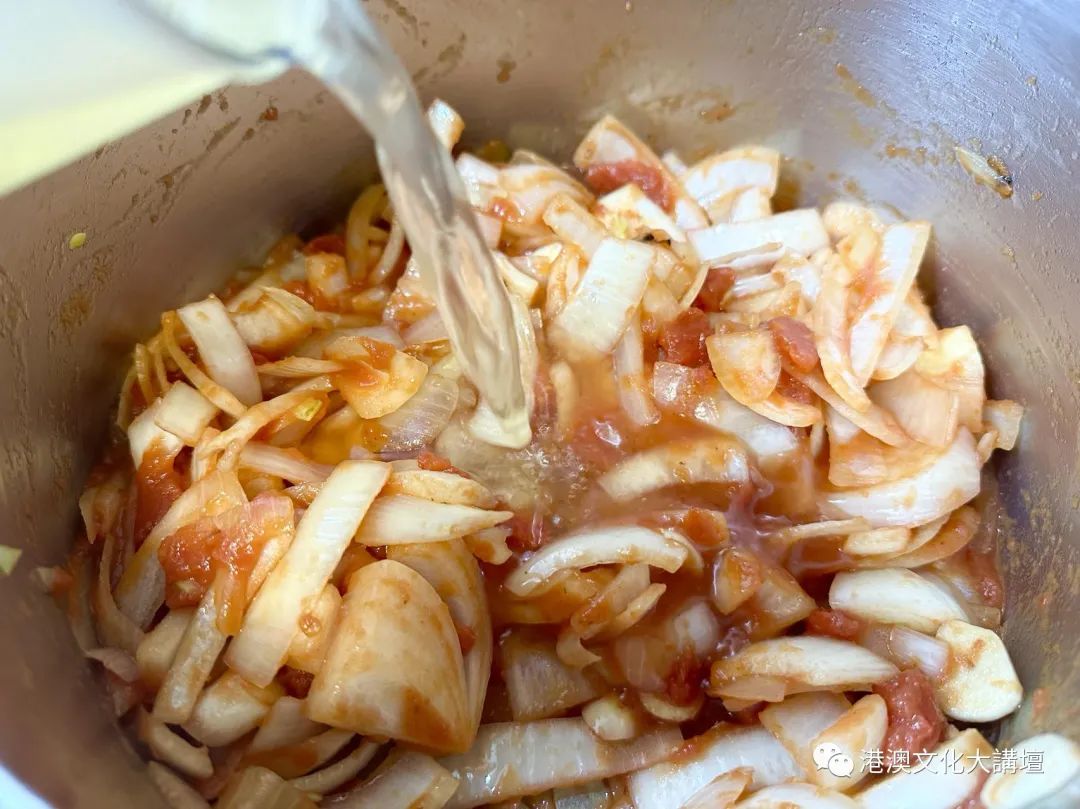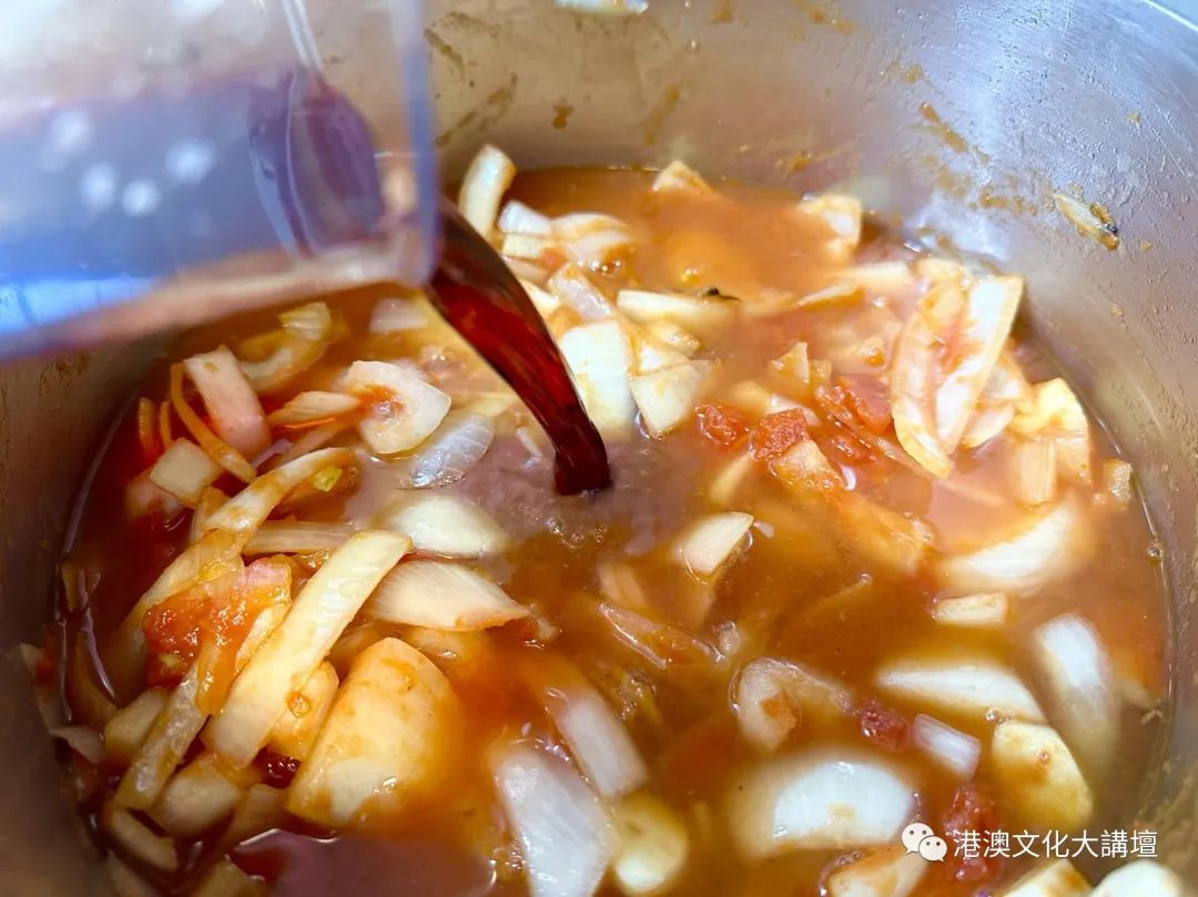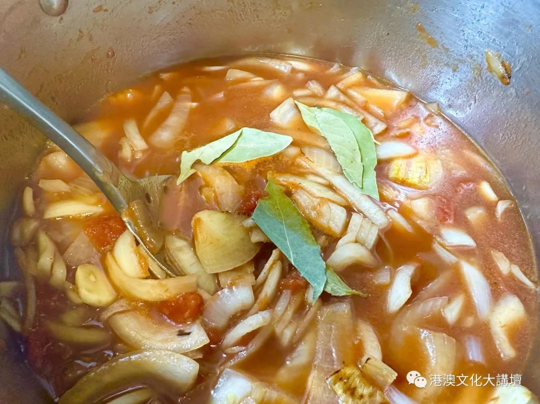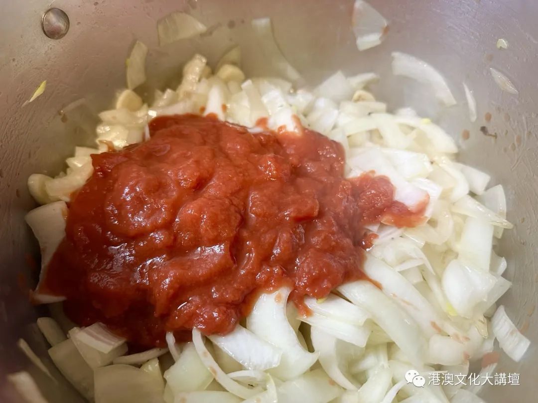 4、加入蕃茄肉粒拌勻,再倒入牛肉湯和紅酒,然後加入香葉,用中火煮滾,不要關火,繼續煮20分鐘,直至煮到沒有酒精和洋蔥已經煮軟。