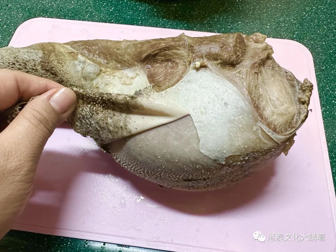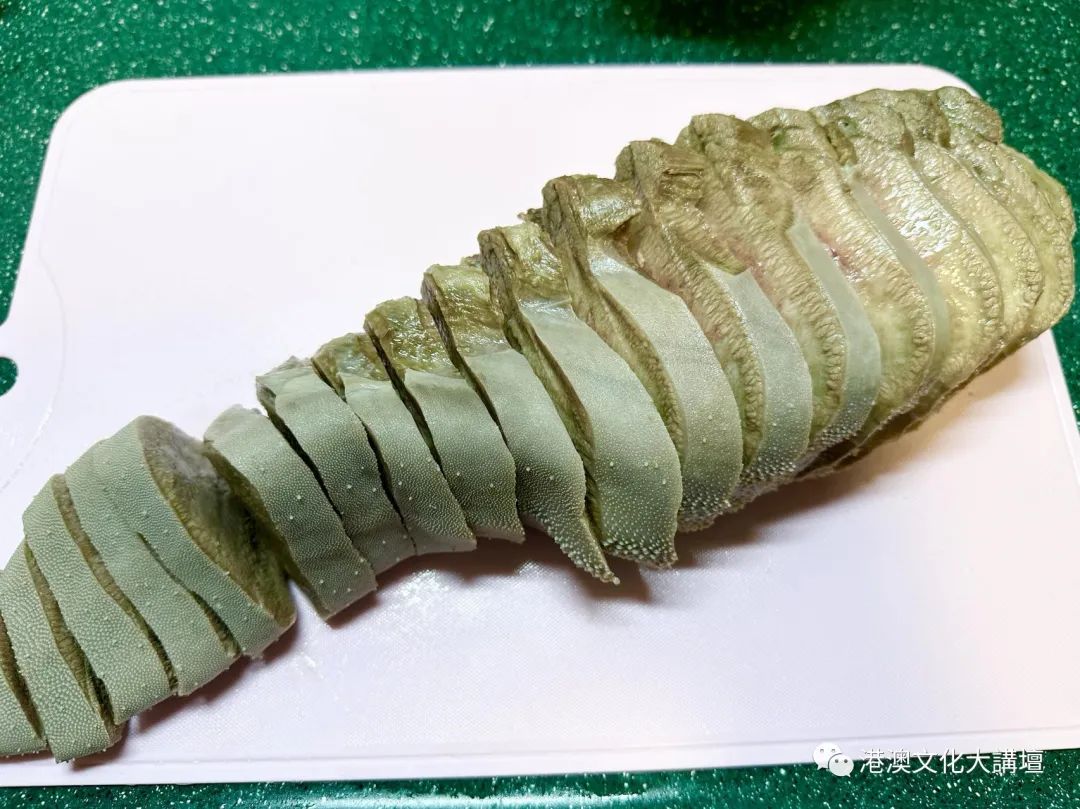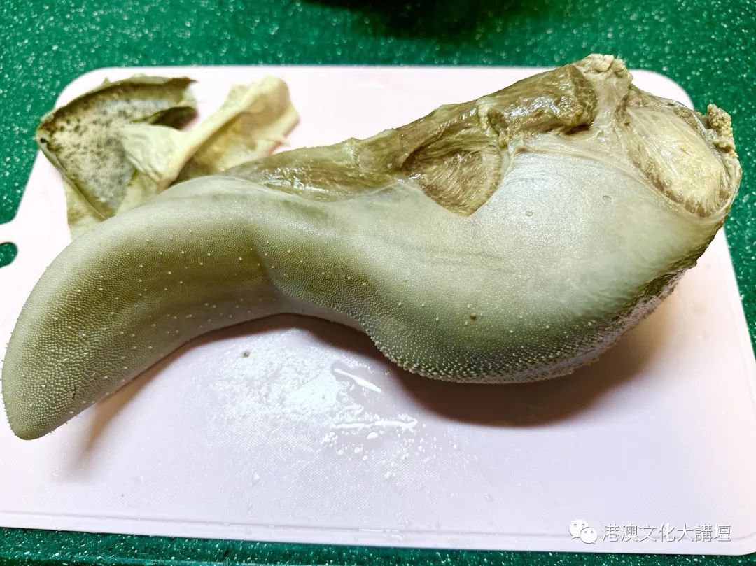 2、將牛脷撈起,去皮,然後切片,厚度為1厘米,切好後備用