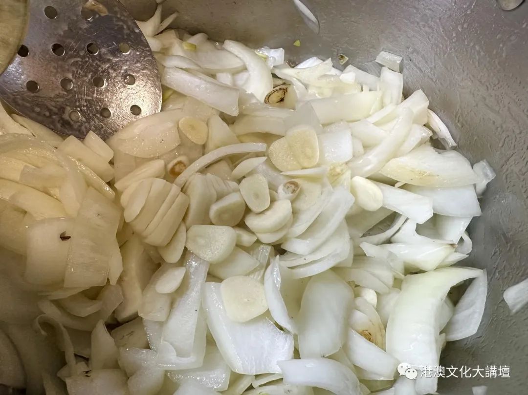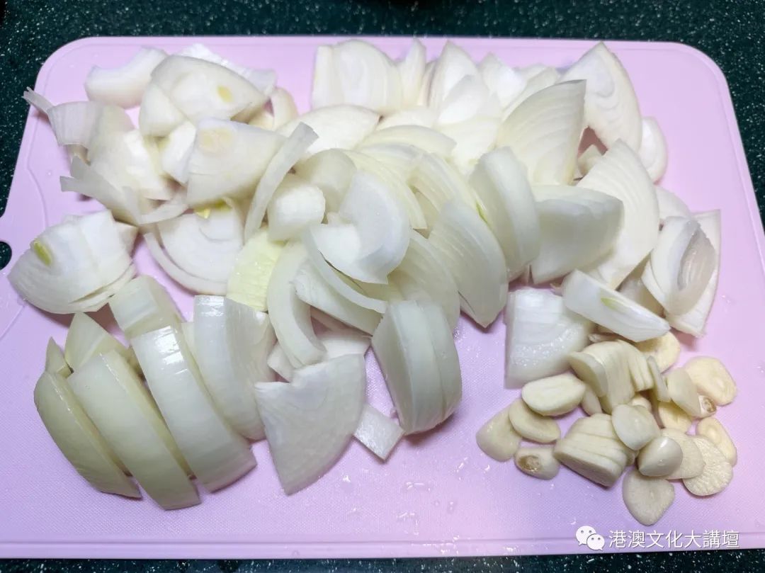 3、將洋蔥和蒜切碎,先用橄欖油炒香洋蔥,再加入蒜炒一炒
