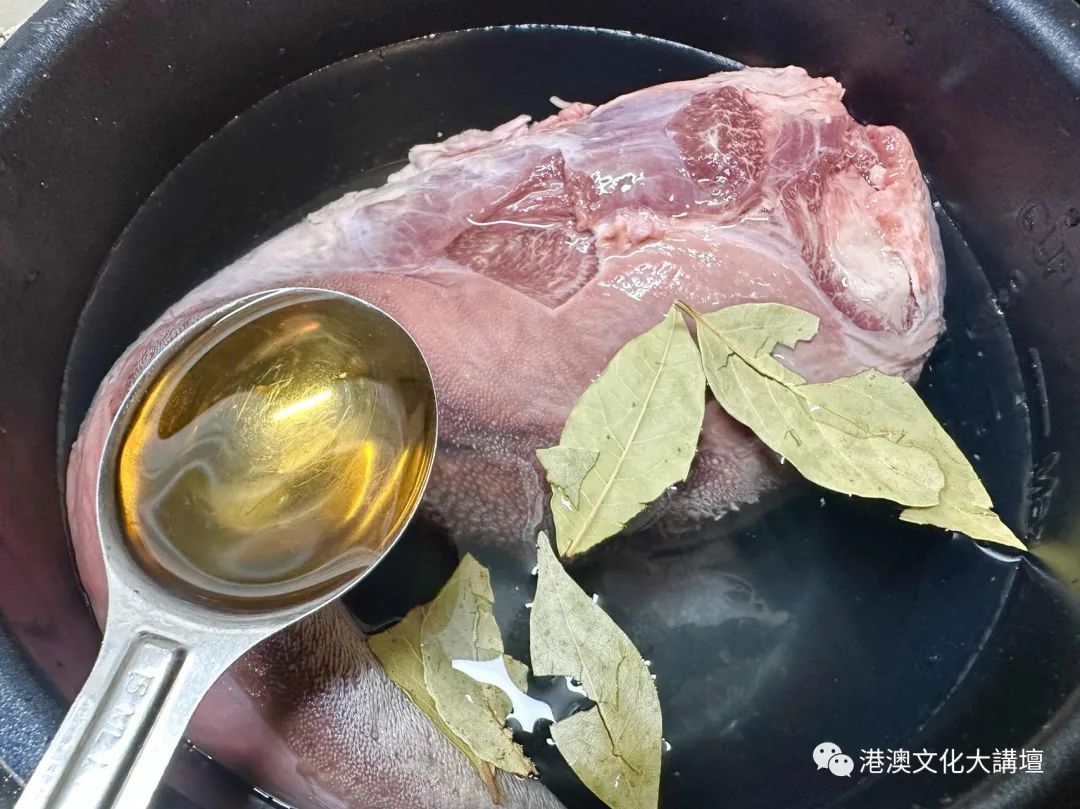 1、將牛脷洗淨,放入壓力鍋內,加入清水、香葉和白蘭地,壓20分鐘並等到自然開蓋。
