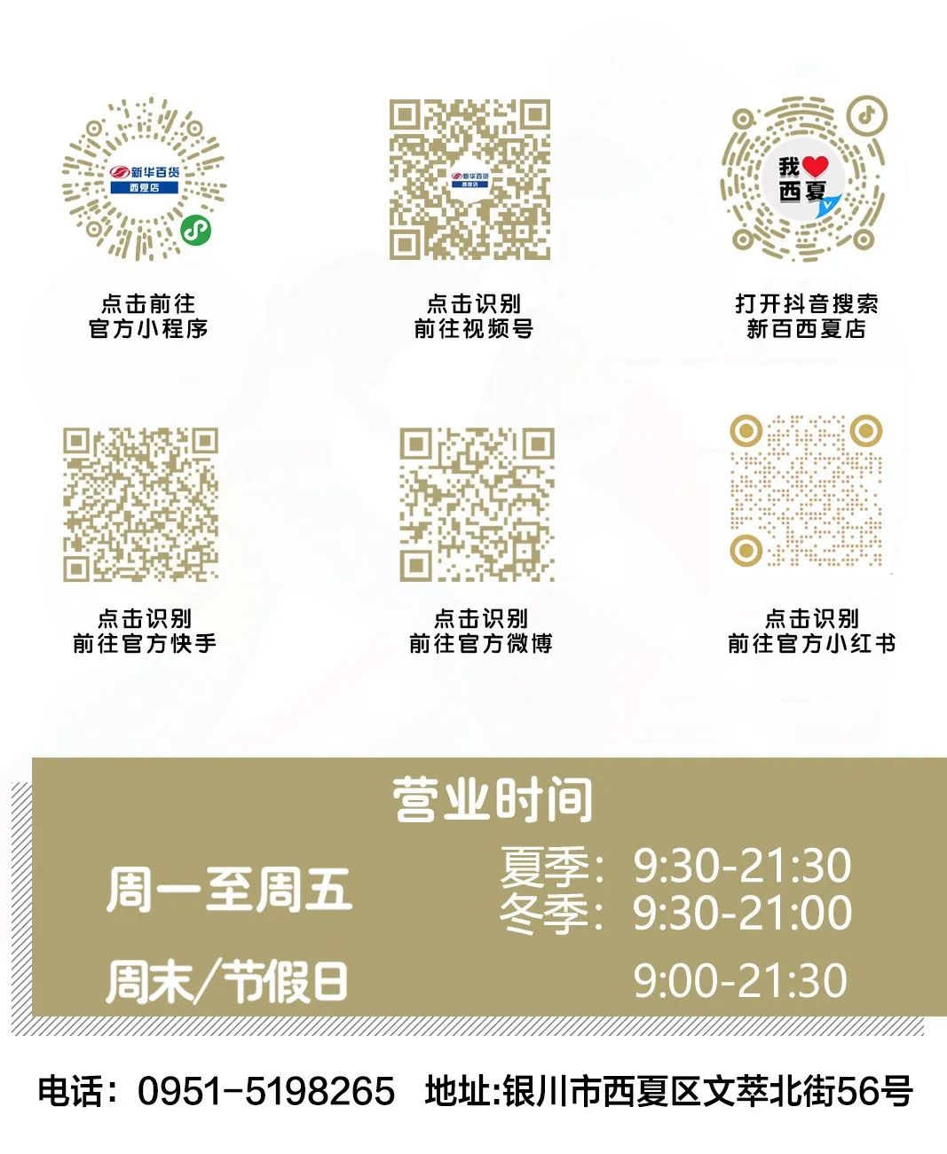 【版权与免责声明】本微信号平台主体为百货商场,所发文章中或有部分字体,图片,数据等素材来自网络 / 转自商场内品牌发布内容,如发现本文所发文章(包括字体、图片、音频、视频等)侵犯了第三方版权,请及时在本平台留言或拨打电话0951-5198263告知,我们会及时备注版权信息,如反对本平台使用将立即进行删除;