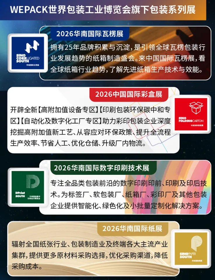 2026年4月15日至17日,WEPACK世界包装工业博览会将在深圳国际会展中心(宝安)举行。本届博览会覆盖包装全产业链,汇聚七大专业系列展览,集中展示从原材料、加工设备到终端产品的前沿技术与解决方案。展会以国际化为导向,致力于推动产业链协同合作与创新融合,助力企业把握全球市场机遇,实现可持续发展。