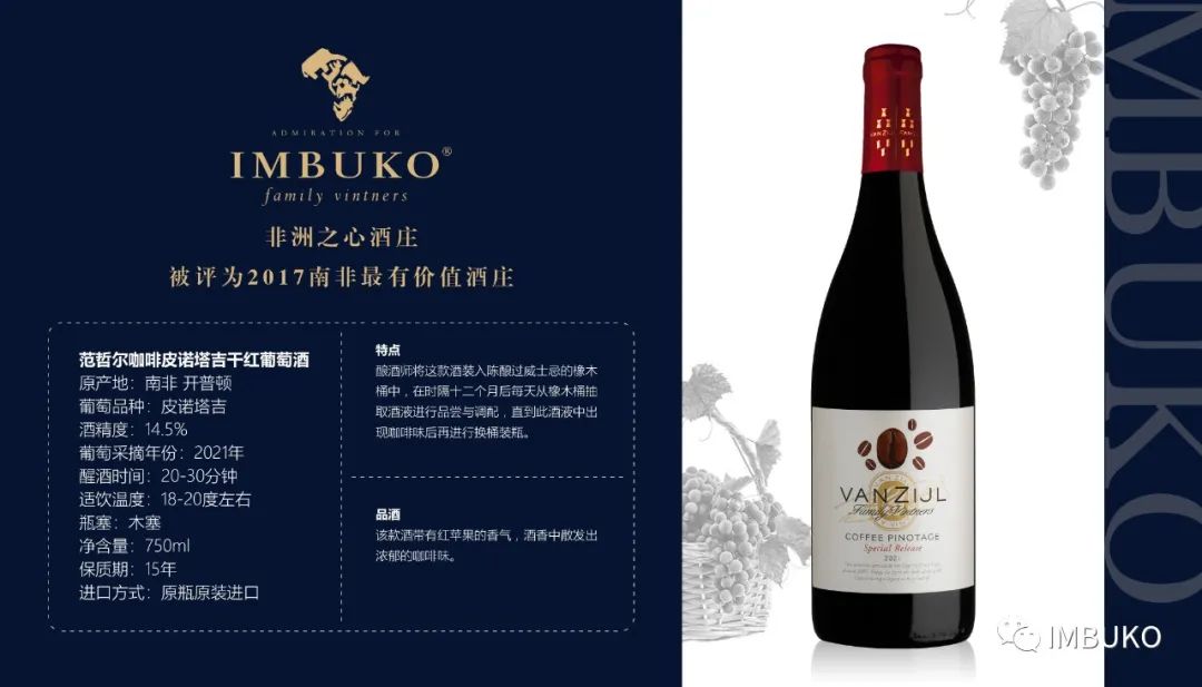 故事最早开始于2004年,当时Theunis & Annalize van Zyl 开始 Imbuko 红酒事业,他们租来的“苏格兰办公室”式房子里有一个古老的黄色木材的厨具,还有他们过时的电脑以及他们银行账户里的R1200。对于 the Van Zyl's 早期的时间是艰难的,两个小孩子长期付出许多的勇气和奉献使得在同时拥有对 Pinotage ; 和 Chenin Blanc 50000 升散装订单。其余的是历史,不久以后IMBUKO品牌创建展示在非洲的酒瓶上面。IMBUKO办公室今天能骄傲的站在惠灵顿的27公顷的UITKYK农场。