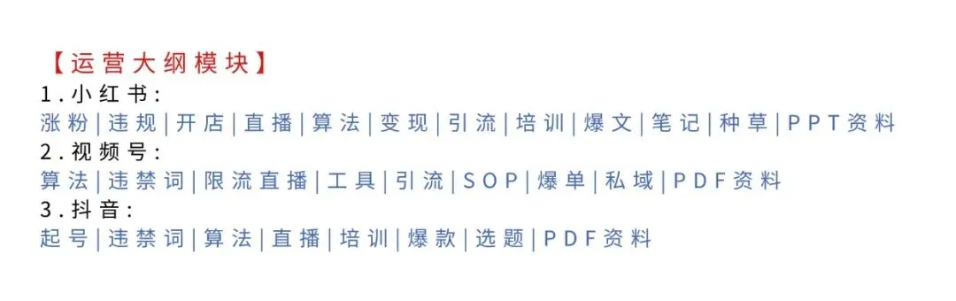 需要运营大纲模块:小红书,视频号,抖音等运营资料的关注我找客服哦!