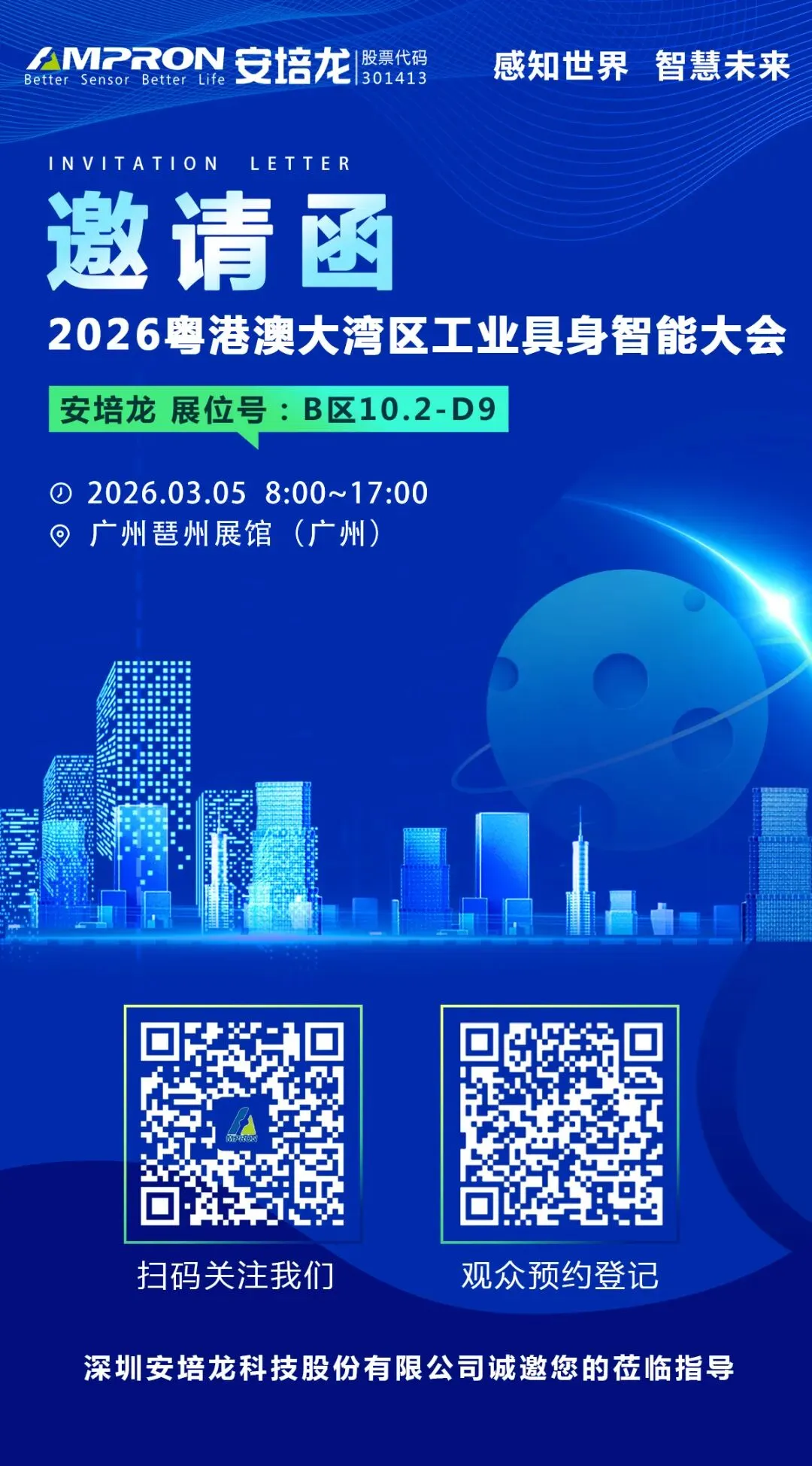 2026年3月5日,深圳安培龙科技股份有限公司将携带自主研发的六维力传感器、扭矩传感器、单向力传感器、足底力传感器等多款核心传感器产品亮相2026粤港澳大湾区工业具身智能大会。届时,我们诚邀您莅临展会现场,共话技术创新,共谋产业未来!