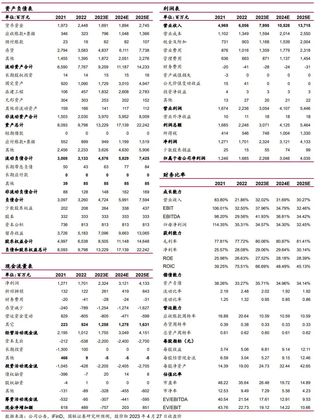 毛利率随产品结构变化发生小幅波动,而疫情放开后公司营销投入强度逐渐恢复,销售费用率回升,净利率同比略有下滑,具体来看,23Q1毛利率、净利率、销售费用率、管理费用率分别为78.38%、28.16%、19.26%、8.10%,分别同比变化-2.45pct、-0.23pct、+0.80pct、-2.36pct,环比22Q4分别变化+2.63pct、-5.75pct、+5.77pct、+3.05pct。