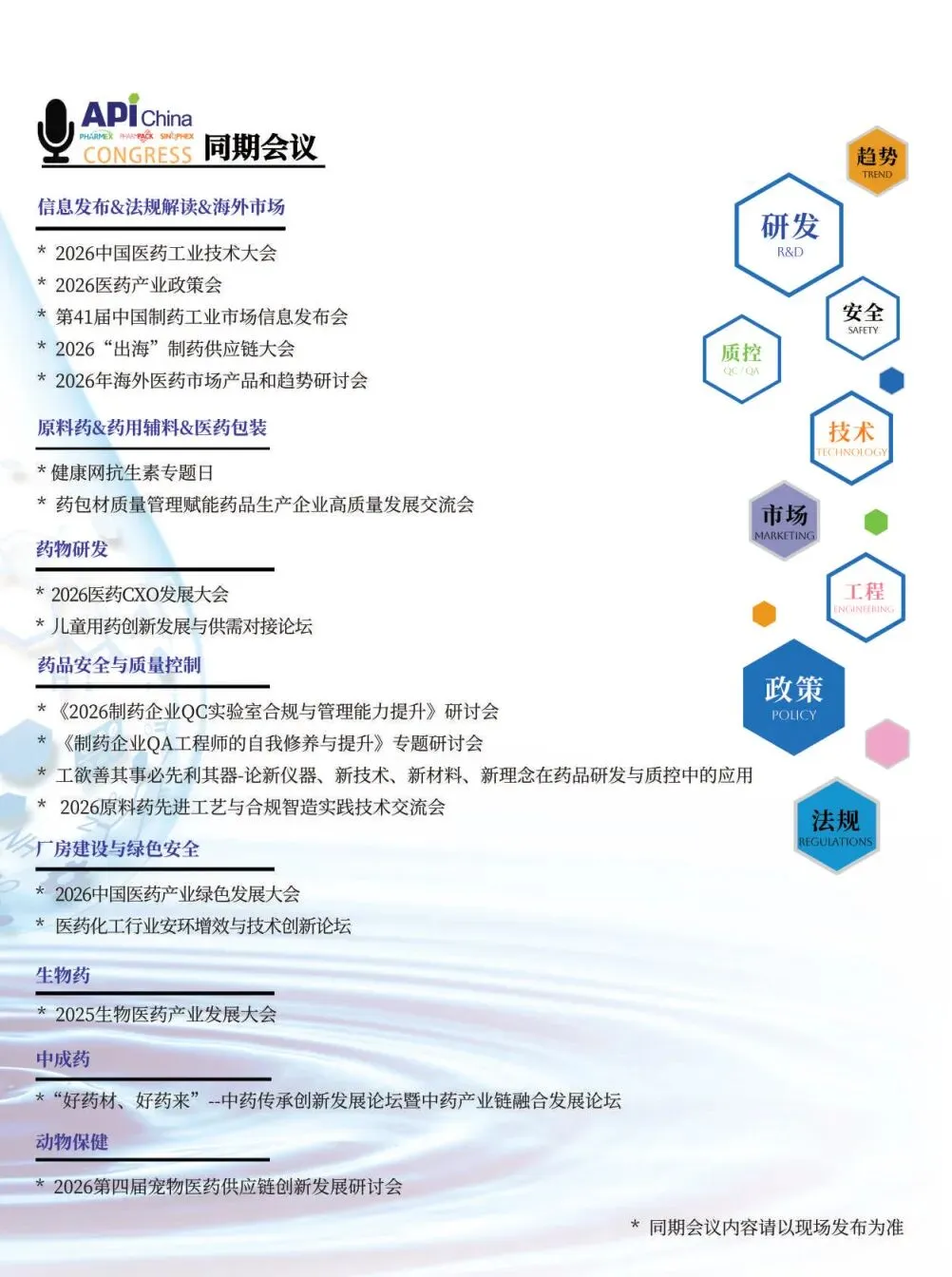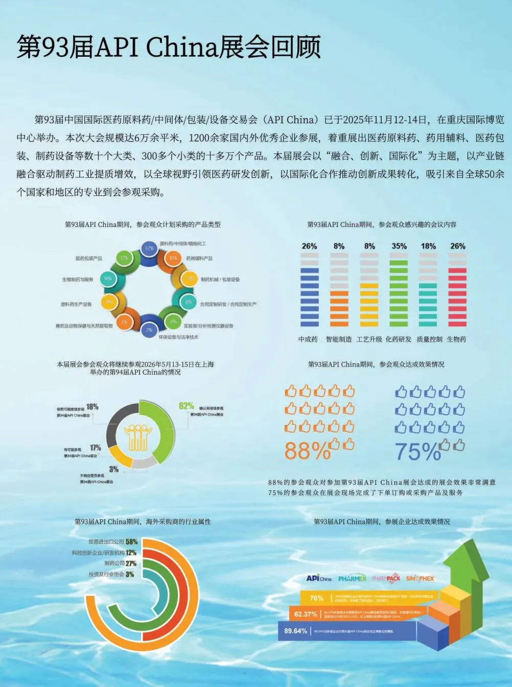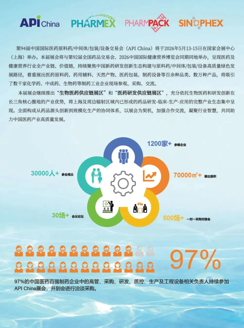 第94届中国国际医药原料药/中间体/包装/设备交易会(API China)将于2026年5月13-15日在国家会展中心(上海)举办。本届展会将与第92届全国药品交易会、2026中国国际健康营养博览会同期同地举办,呈现医药及健康营养行业全产业链、价值链,持续聚焦中国新药研发创新生态构建与原料药/中间体/包装/设备高质量绿色发展路径,着重展出医药原料药、药用辅料、天然产物、医药包装、制药设备等百余种品类、数万种产品,将吸引了数千家化学药、中成药、生物药等制药工业企业现场参观、采购、交流。
