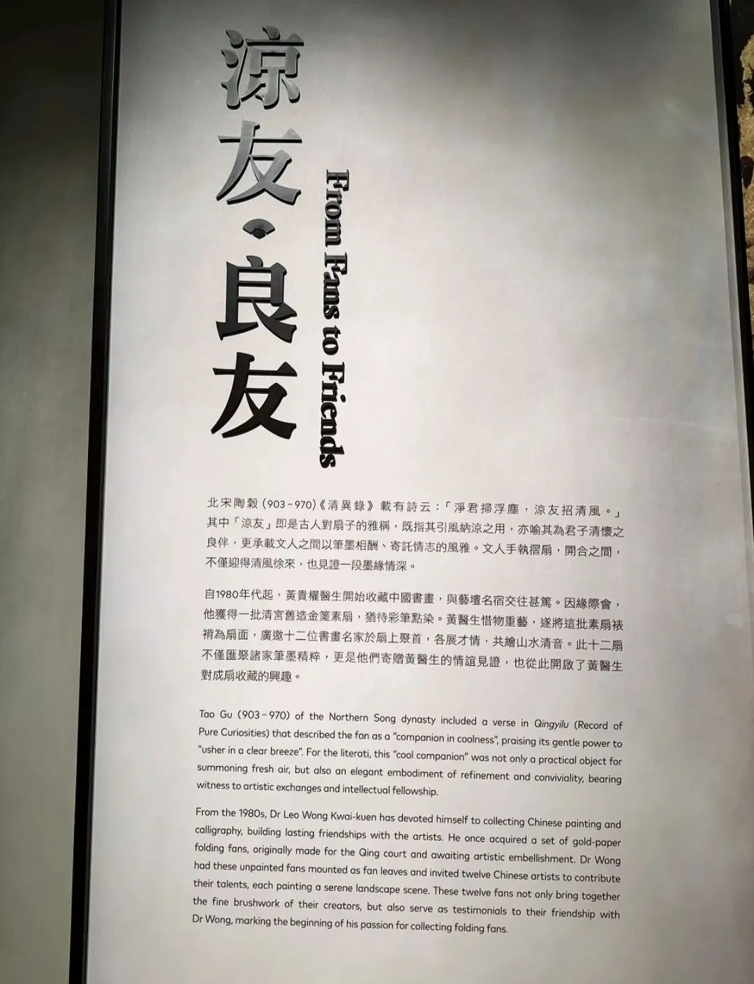 香港收藏家黄贵权自2021年起将其静观楼藏品捐赠予香港艺术馆,这批藏品以二十世纪中国书画为核心,其中尤以晚清至近现代之折扇与扇面最为丰富,名家荟萃,题材多样。