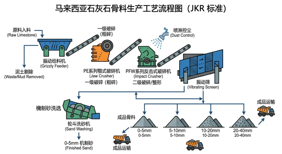 石灰石硬度中等、磨蚀性低,但极易产生粉尘和针片状物料。一套专业的生产线,必须通过科学的“破碎+筛分”组合,确保成品满足马来西亚JKR(公共工程局)的严苛规范。
