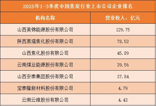 根据申万行业分类,2025年1-3季度中国焦炭行业上市公司按营业收入排名如下:(A股上市公司)