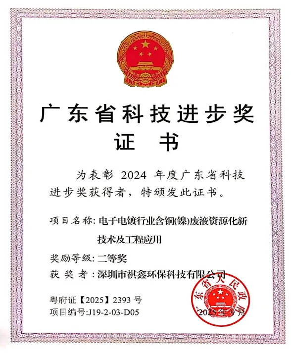 近日,2024年广东省科技进步奖证书正式发放,深圳市祺鑫环保科技有限公司联合深圳大学、东江环保股份有限公司、东莞理工学院等六家单位共同攻关的《电子电镀行业含铜 (镍) 废液资源化新技术及工程应用》项目,凭借颠覆性技术突破与重大产业价值,荣膺二等奖!值得重磅关注的是,这是环保提铜行业内首家斩获该省级权威奖项的企业,这份荣誉不仅是对祺鑫环保技术创新实力的最高肯定,更标志着我国环保提铜领域技术水平迈入先进行列,含金量十足!
