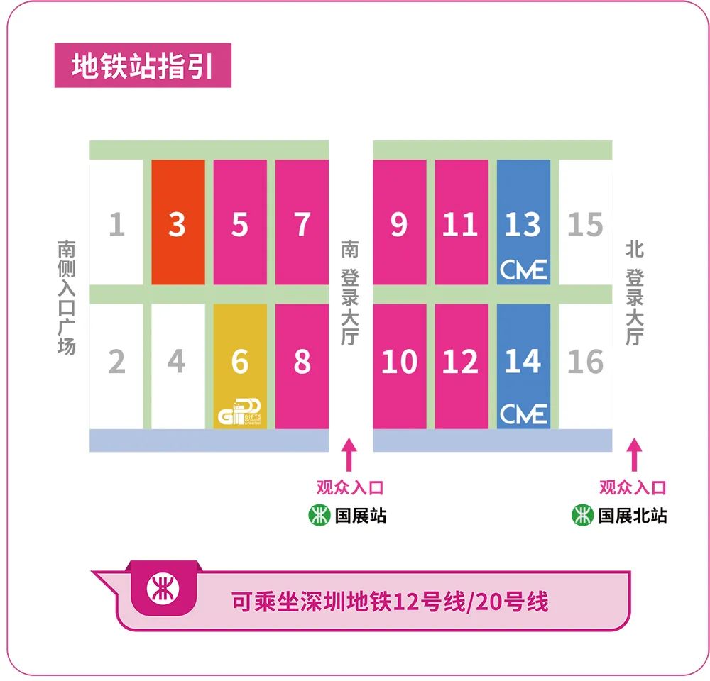 地铁1号线机场东换乘12号线到国展站(C1、C2出口到达南登录大厅临近3/5-10号馆)、国展北站(C1、C2出口到达北登录大厅临近11-14号馆)
