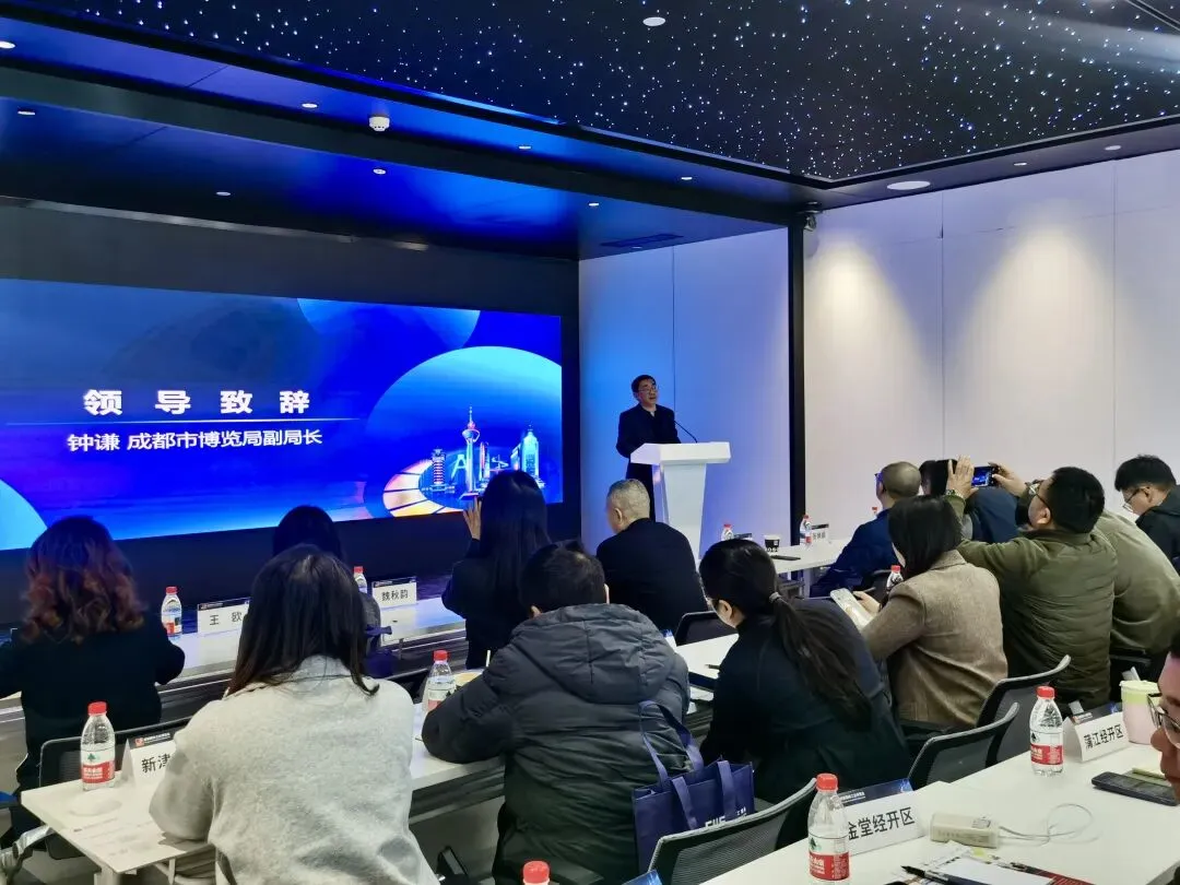成都市博览局党组成员、副局长钟谦出席活动并致辞,成都市经信局市新经济委、四川天府新区文创和会展局、成都国际商会等单位相关负责人,以及东浩兰生上海工业商务展览有限公司、汉诺威米兰展览(上海)有限公司、四川鹏璨文化传媒有限公司等展会主办等单位代表出席活动,活动由四川天展展览有限公司副总经理董铮主持。