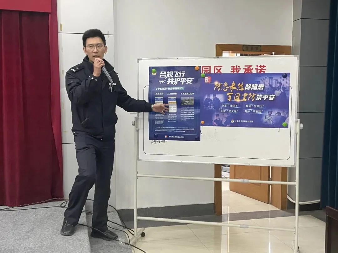 培训会上,区公安分局网安支队和枫泾派出所、兴塔派出所民警分别围绕网络安全、无人机备案、反诈防范等内容开展宣讲。