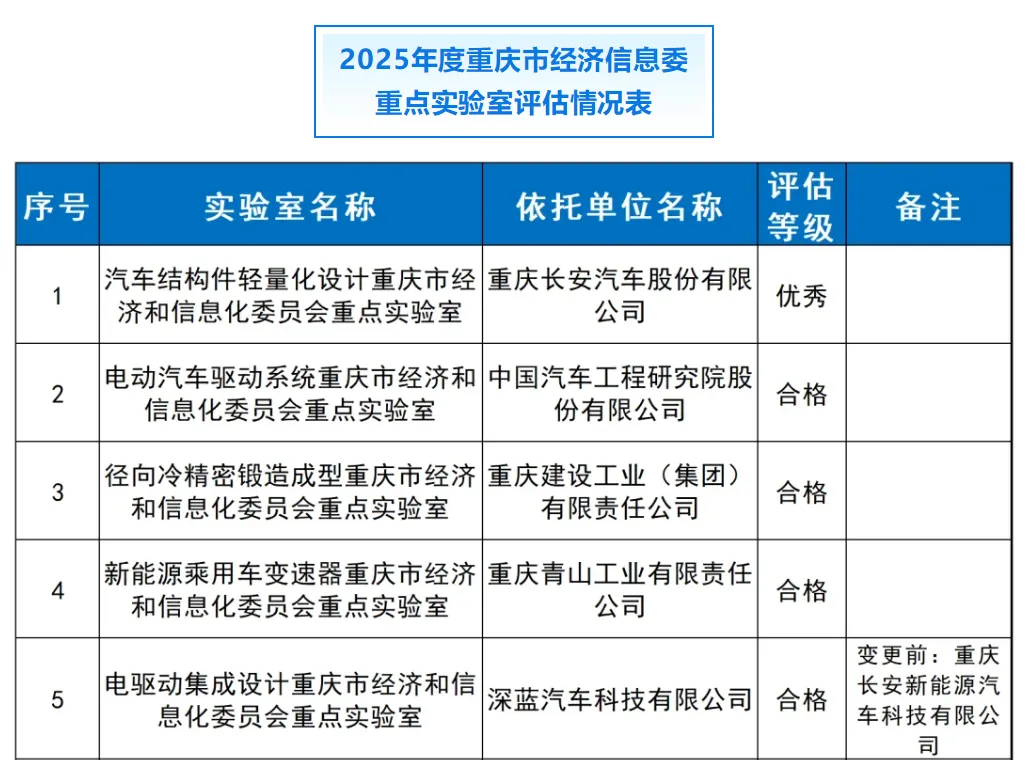 近日,从重庆市经济和信息化委员会传来好消息,在2025年度重庆市工业和信息化重点实验室认定和评估工作中,由长安汽车负责的“汽车结构件轻量化设计重庆市工业和信息化重点实验室”凭借卓越的综合实力,于2026年1月30日正式获评“优秀”等级。值得一提的是,该实验室是本年度重庆市唯一一个获评“优秀”的重点实验室。近三年来(2022-2025年),实验室紧扣汽车轻量化核心技术创新,在关键技术突破、科研体系建设及人才成果转化等方面取得了显著成效,已成为长安汽车轻量化技术创新的核心引擎。