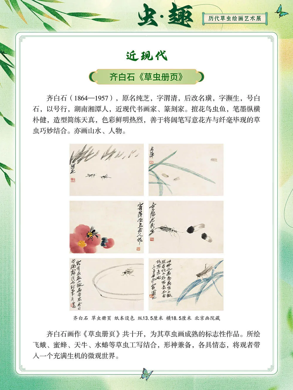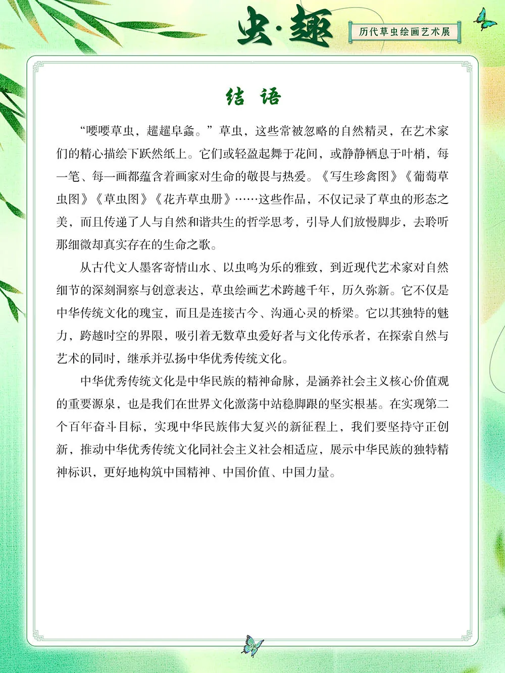 本次展览通过展示古今众多名家创作的草虫画,展现我国草虫画发展的轨迹与艺术成就。让我们跟随本展览,走进画家笔下的草虫世界,感受大自然在微渺处的勃勃生机。