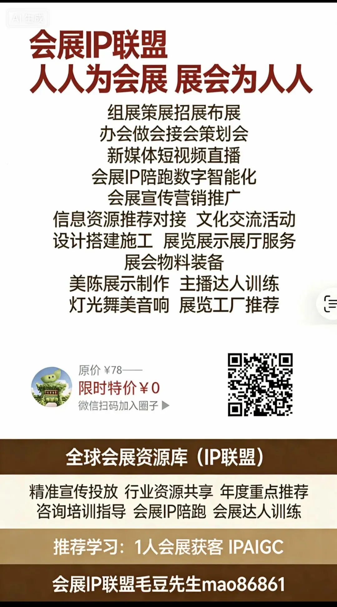 会展IP联盟:9500家入驻机构,30个专业社群,15000人同时在线。发起人毛豆先生,25年会展教练经验,8年会展IP实战陪跑。普通用户限时免费注册。