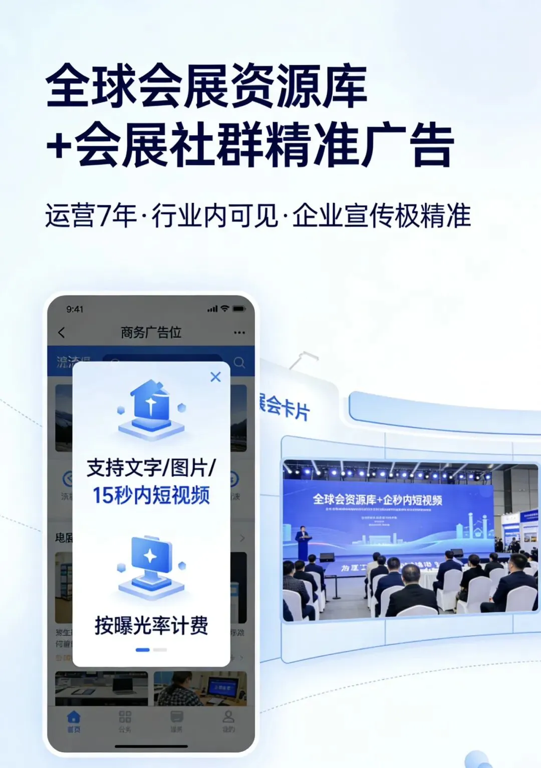 在运营7年的全球会展资源库+会展社群内精准推送,支持文字、图片、15秒内短视频,按曝光率计费,仅行业内可见,企业宣传极精准。