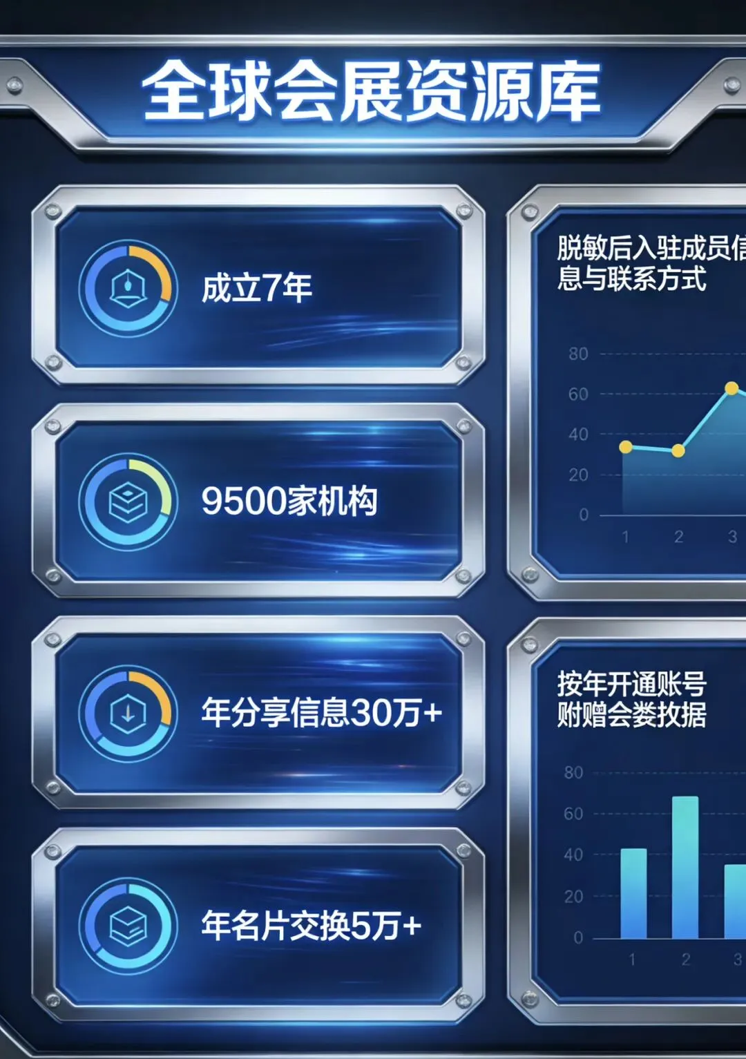 开通全球会展资源库后台共享。资源库成立7年,9500家机构,年分享信息30万+,年名片交换5万+。可查看脱敏后的入驻成员信息与联系方式,按年开通账号,附赠会展数据。
