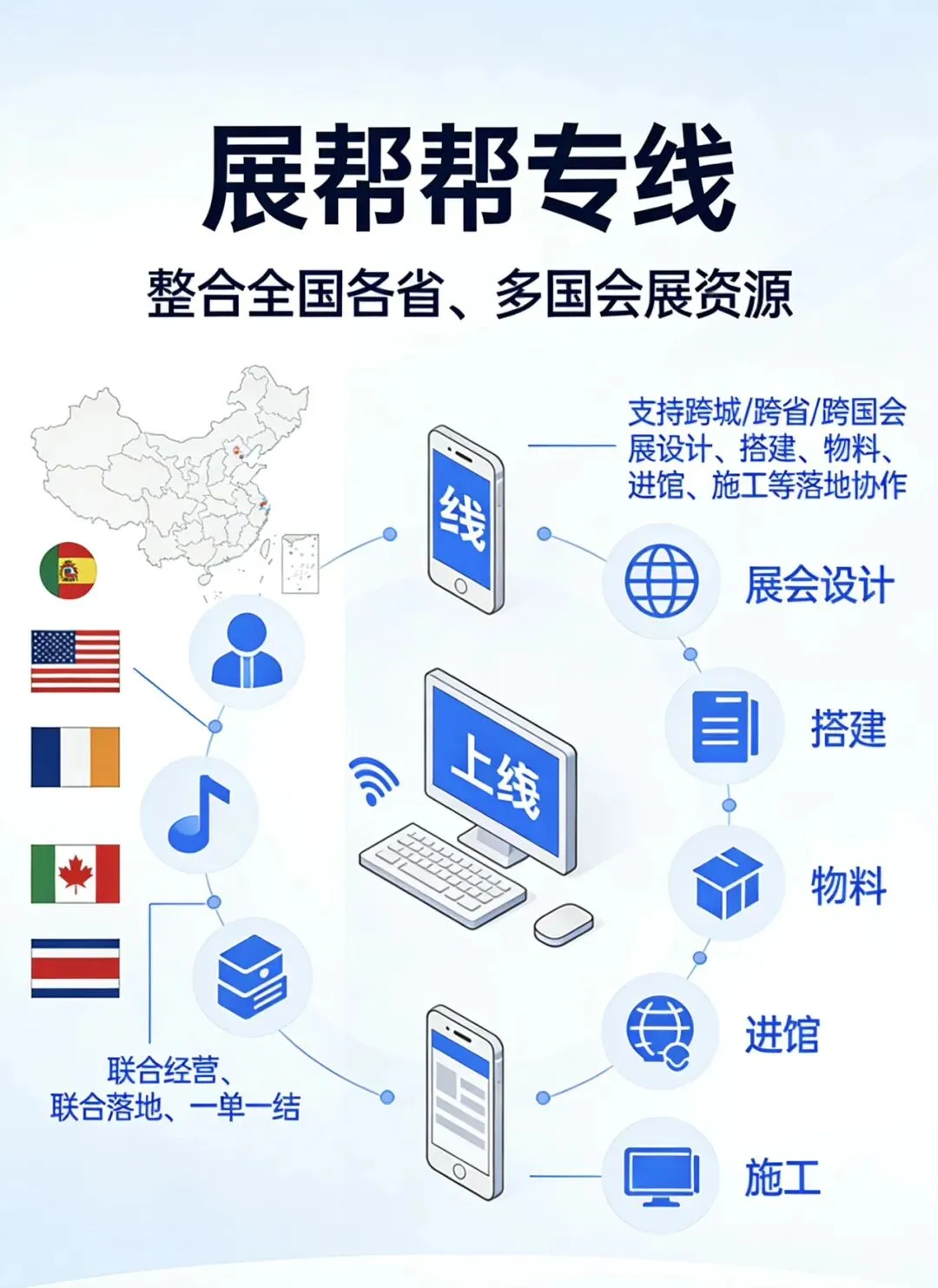 整合全国各省、多国会展资源,联合经营、联合落地、一单一结,线上快速响应。支持跨城/跨省/跨国会展设计、搭建、物料、进馆、施工等落地协作,降成本、防风险。