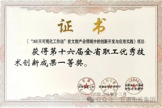 喜报!甘肃电投会展集团《“365天可视化工作法”在文旅产业领域中的创新开发与应用实践》荣获2023年度甘肃省职工技术成果奖一等奖