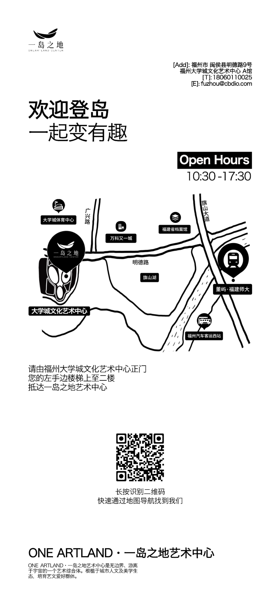 即日起,请以「展览志愿者+姓名+可以服务时间」的形式命名投递简历至 fuzhou@cbdio.com,或扫码添加客服小岛【ONEARTLAND】发送简历,一切展示你优势的介绍均可加入附件(大小不超过10M)。我们将在一周内通知入选志愿者,请及时查看邮箱及对话。