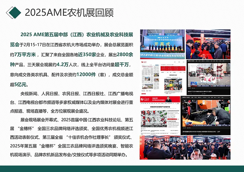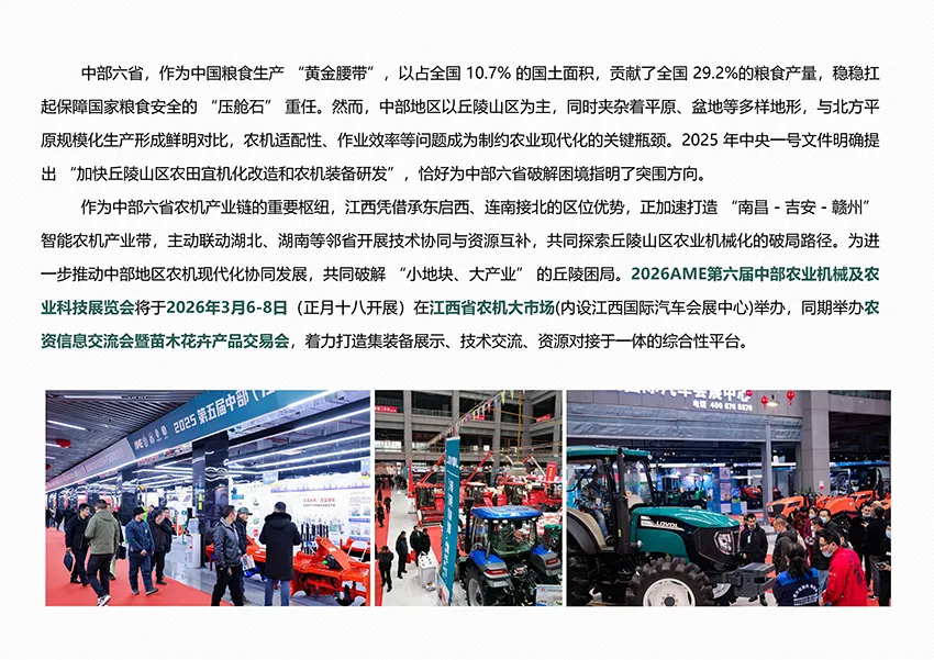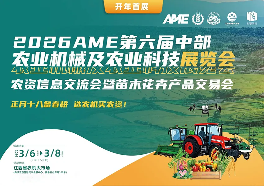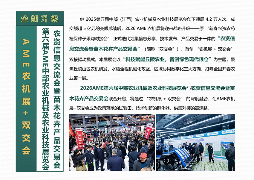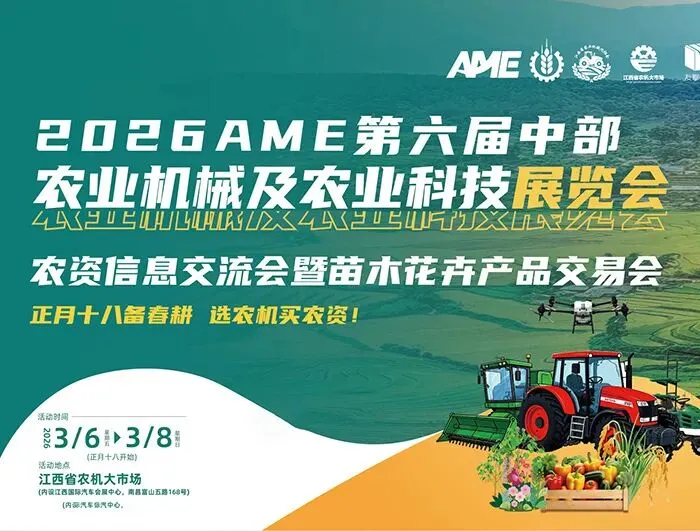 2026第六届中部(江西)农业机械及农业科技展览会及中部农资信息交流会暨产品交易会将通过“农机展+双交会”的深度融合,让AME农机展+双交会成为政策落地的试验田、技术创新的孵化器、供需对接的高速路。