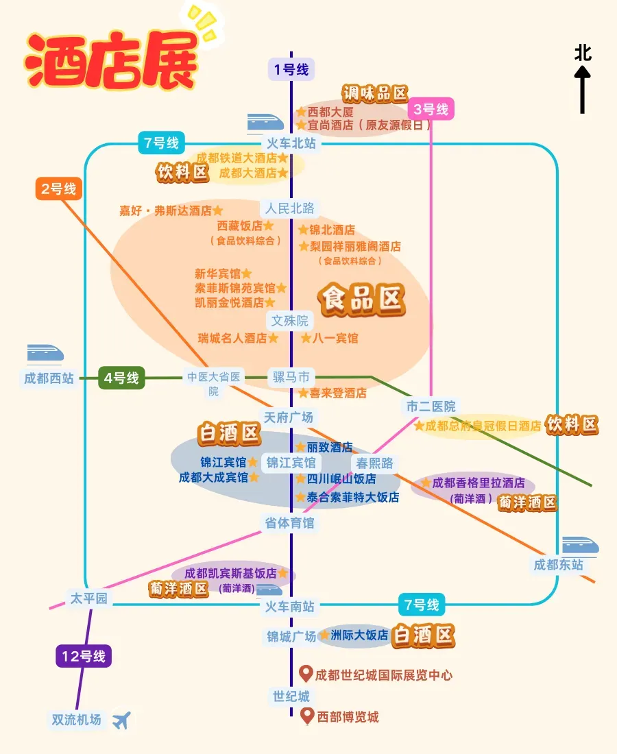 方案①:地铁18号线(往天府机场北方向)火车南站上车(起始站)→西博城站C/D口(靠近食品机械馆 调味品馆)出站,全程直达,车程约20分钟,建议首选。