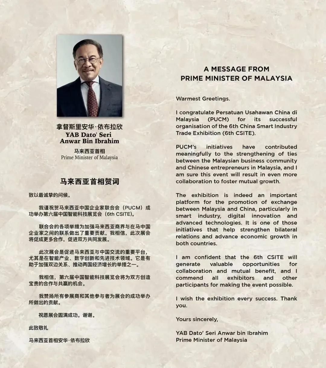 马来西亚首相安华(YAB Dato' Seri Anwar Bin Ibrahim)向第六届中国智能科技展览会(CSITE 2026)致贺词。