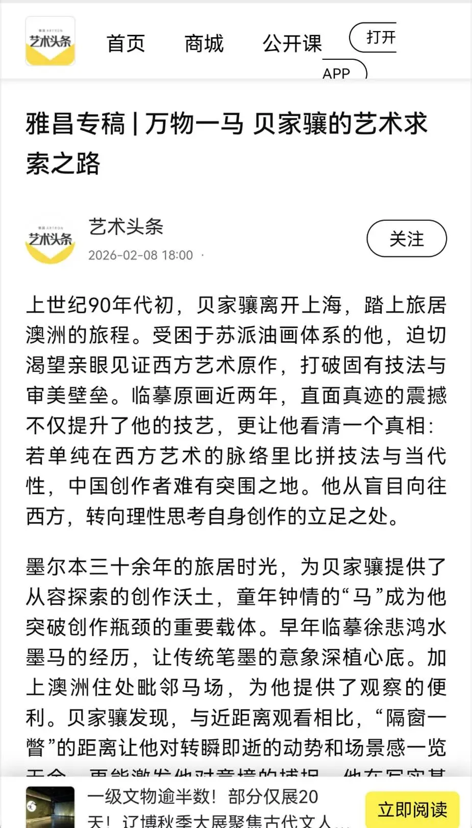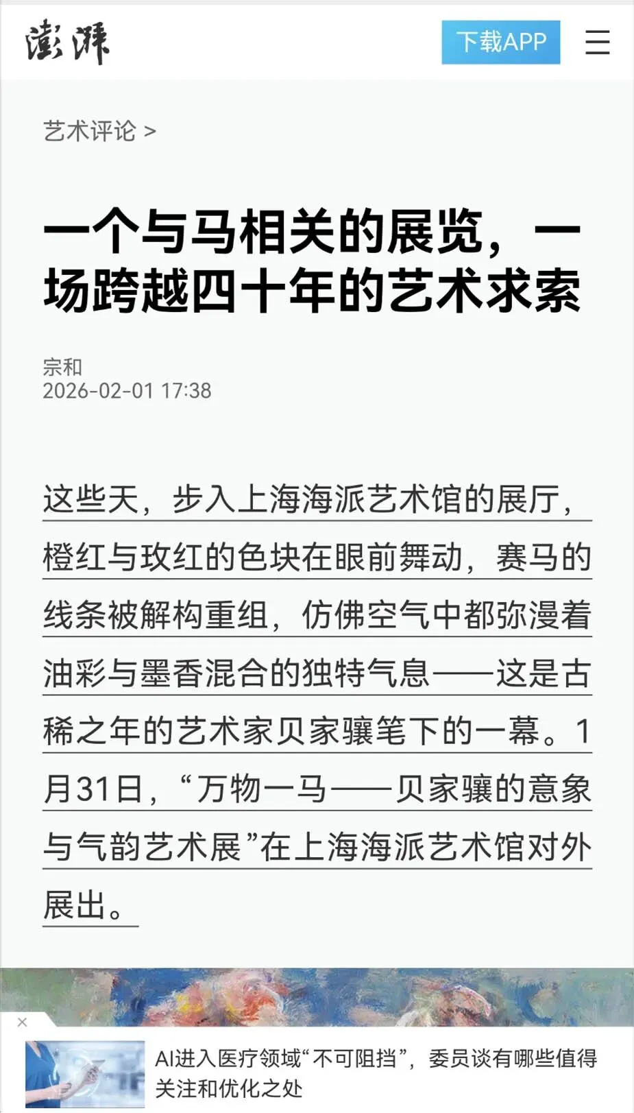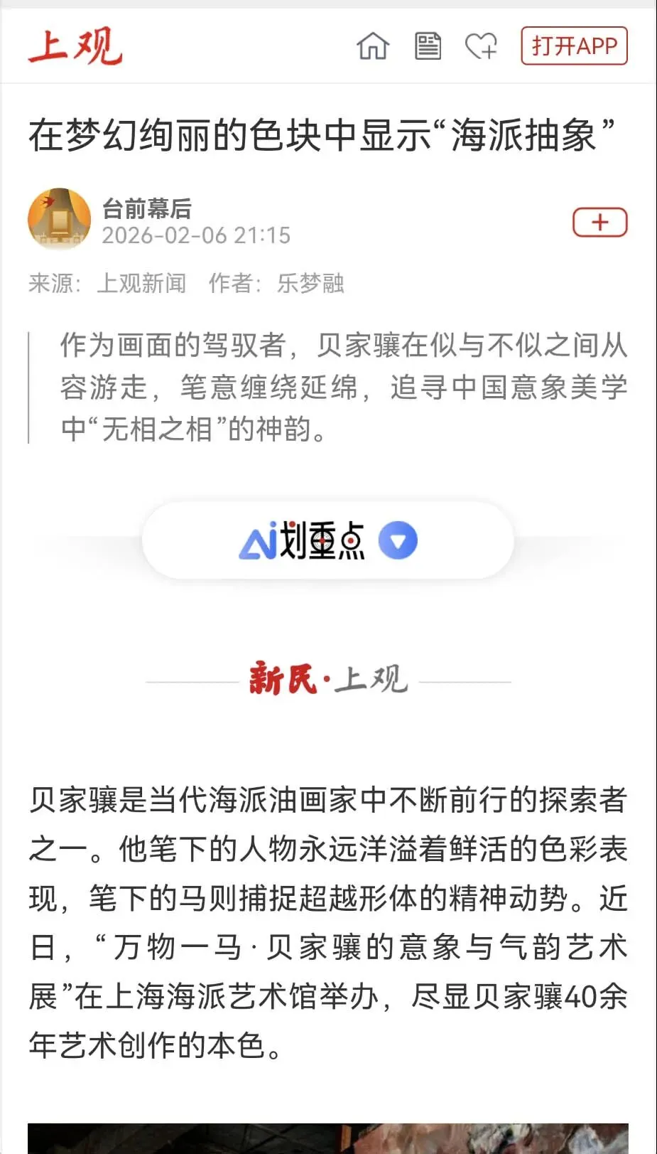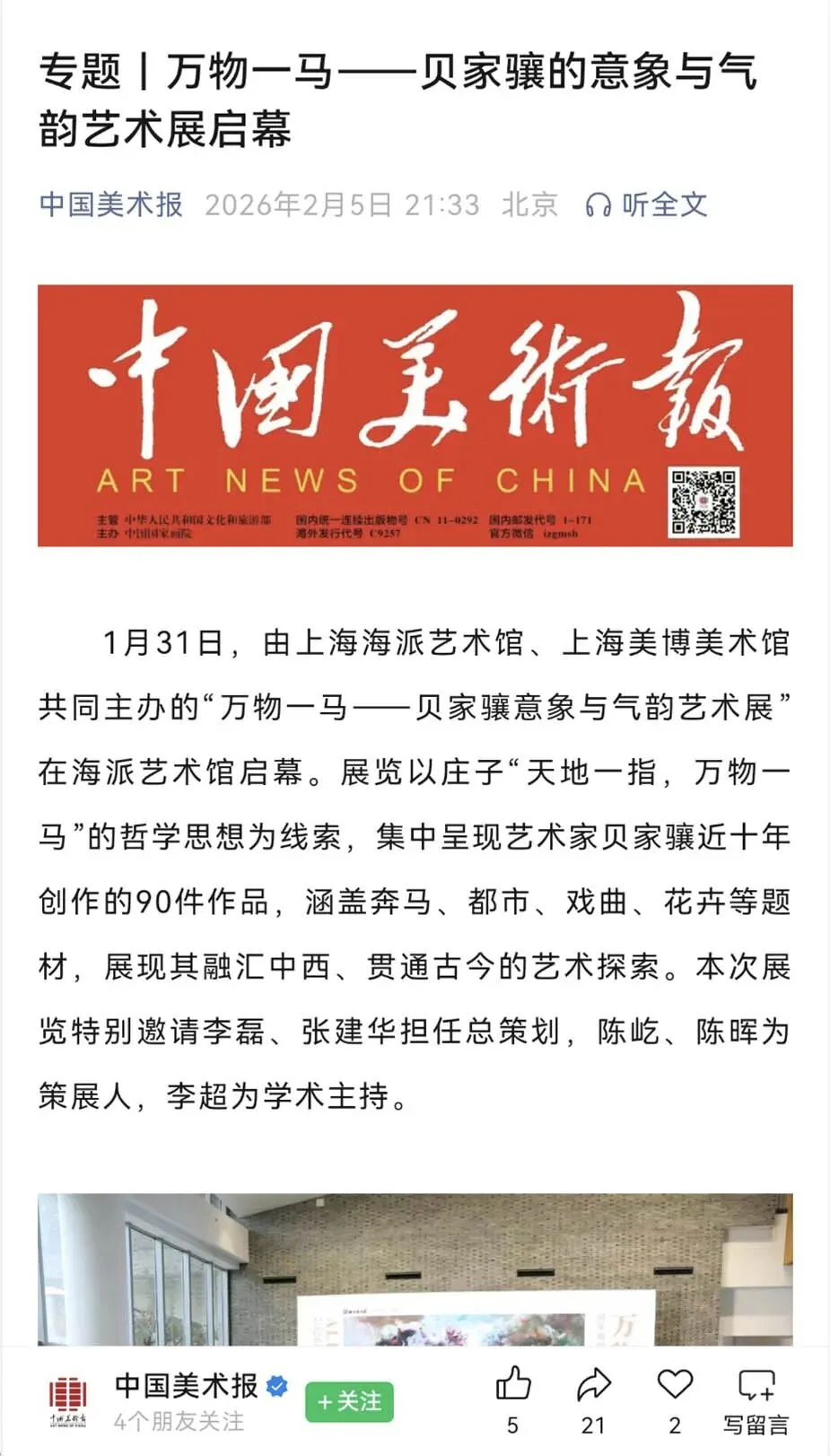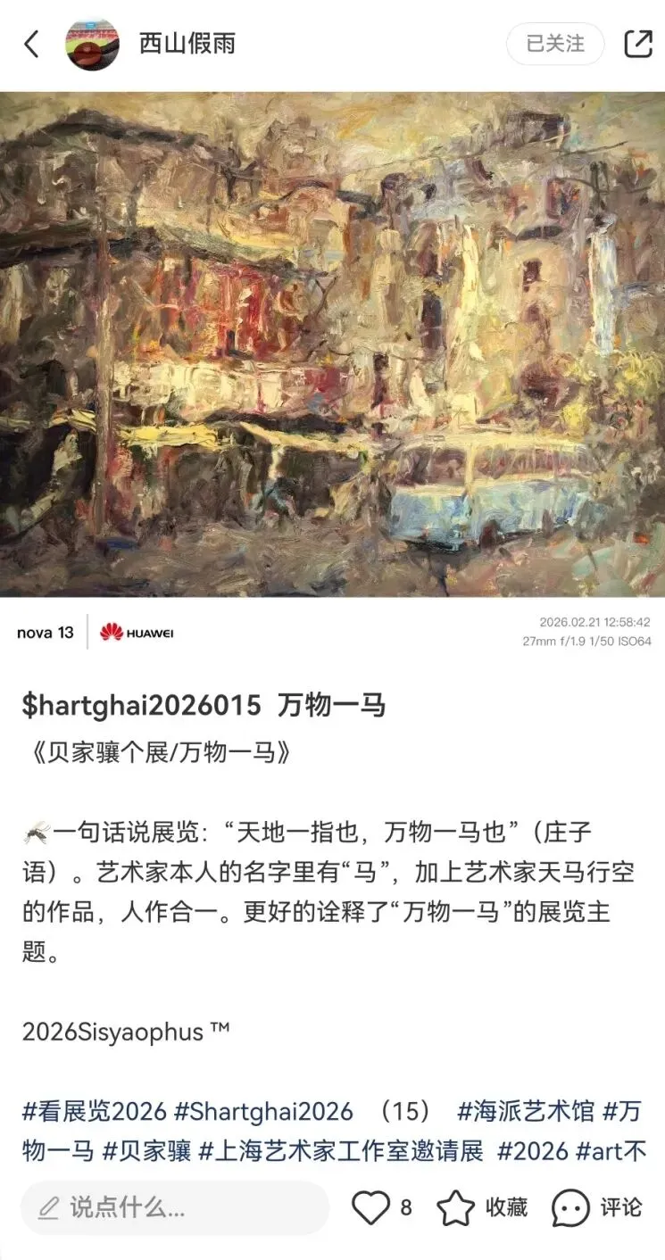 2月26日,海派艺术馆成功举办“万物一马”贝家骧的意象与气韵艺术展学术交流会。作为展览的重要组成部分,本次学术交流会汇聚了十余位知名专家学者与艺术界人士,围绕贝家骧先生的艺术成就及其对中国当代油画发展的启示展开了深度对话。
