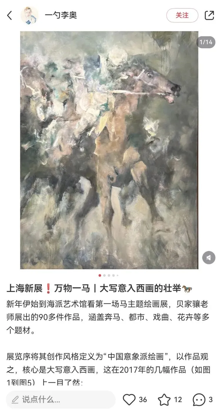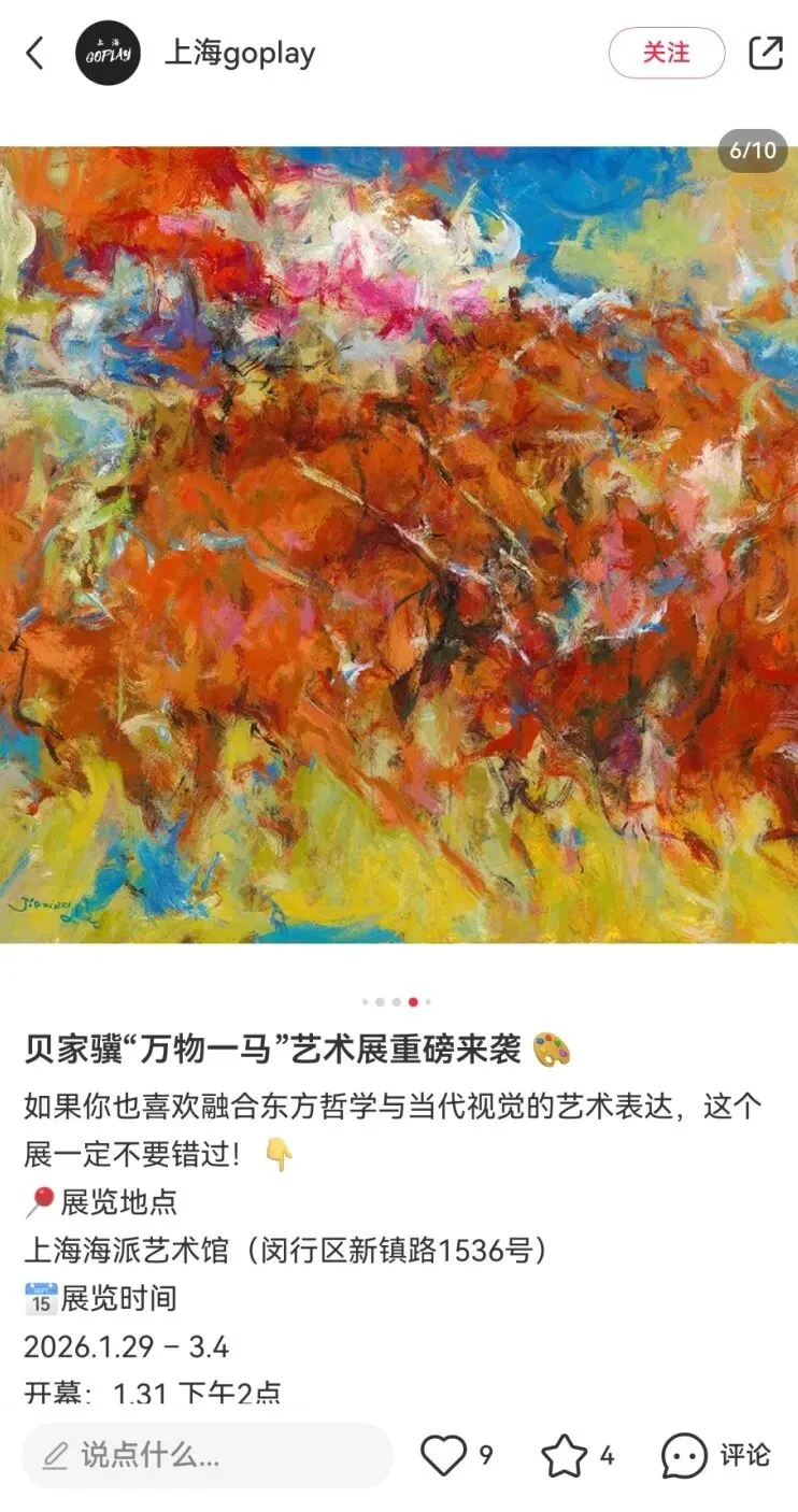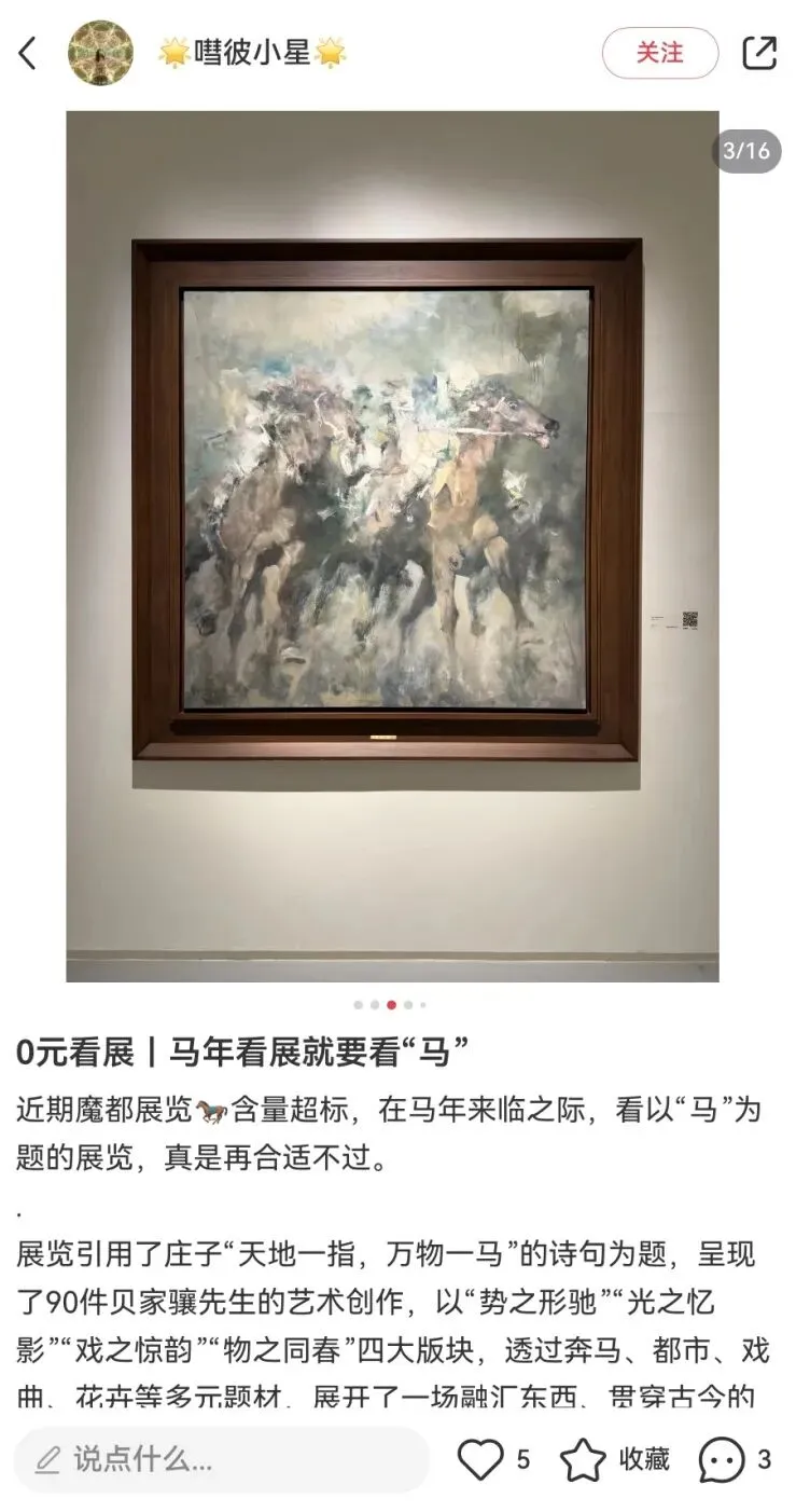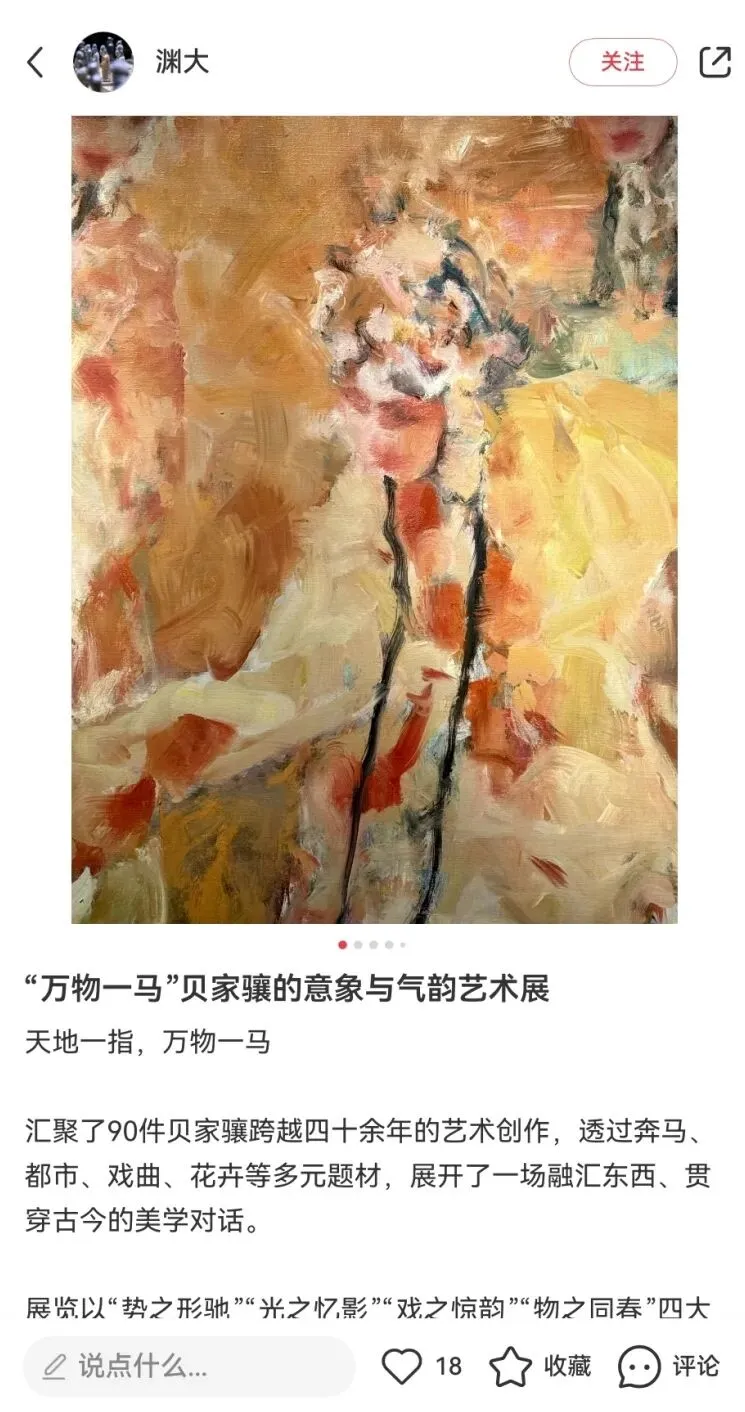 “万物一马”贝家骧的意象与气韵艺术展,展览以庄子“天地一指,万物一马”的哲学为精神线索,汇聚了90件贝家骧跨越四十余年的艺术创作,透过奔马、都市、戏曲、花卉等多元题材,展开了一场融汇东西、贯穿古今的美学对话。