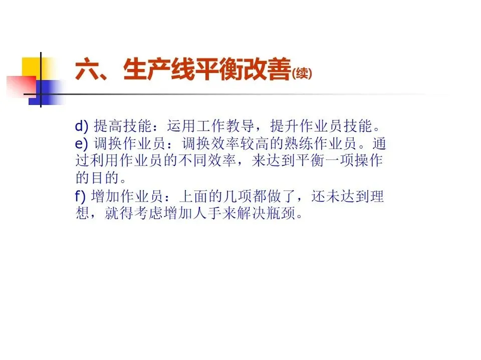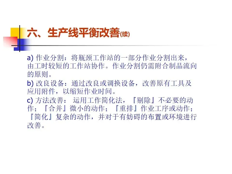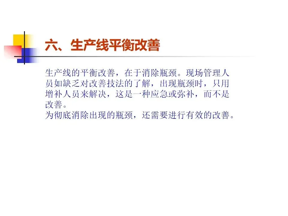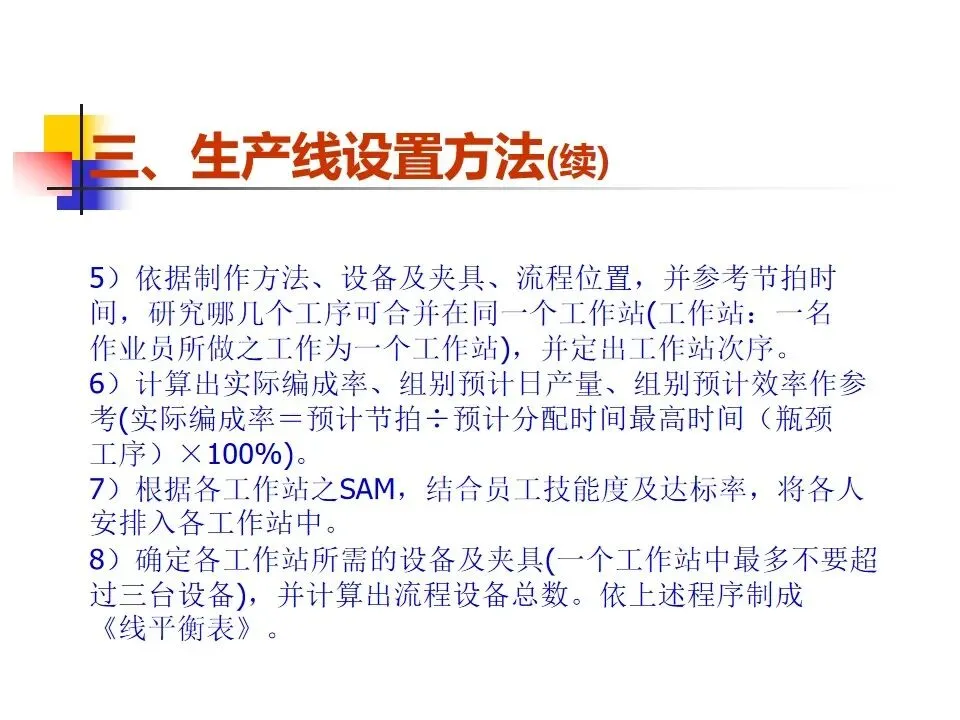 本文围绕生产线节拍(TAKT)的概念及其在生产管理中的应用展开系统阐述,明确了节拍作为平衡生产线节奏的核心工具,旨在通过精确设定生产步调和合理分配工序,实现按时按量生产。内容涵盖了生产线设置的原则与方法,强调从方便管理、质量控制、生产平衡、流水顺畅等多个维度出发,科学构建生产线。通过工序分配、设备布置和线平衡表的制定,确保各工作站时间均衡、流程顺畅。同时,针对生产过程中可能出现的瓶颈问题,提出了多种改善方法,如作业分割、设备改良、方法优化、技能提升等,强调改善的持续性和系统性,而非简单的人员增补。整体而言,该内容为提升生产线效率、优化资源配置、实现精益生产提供了系统的理论指导和实操路径。
