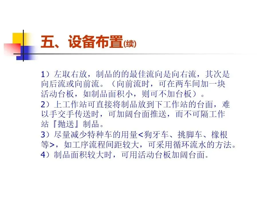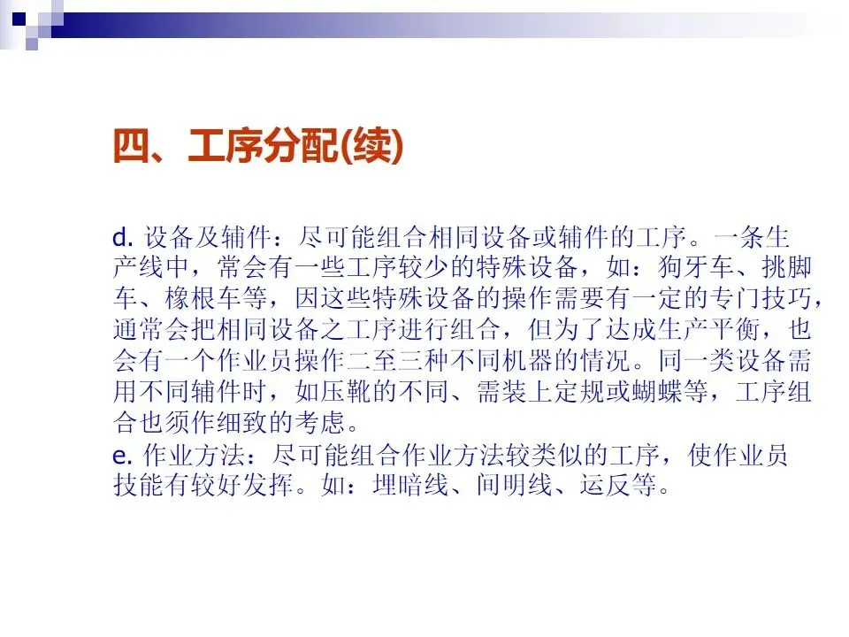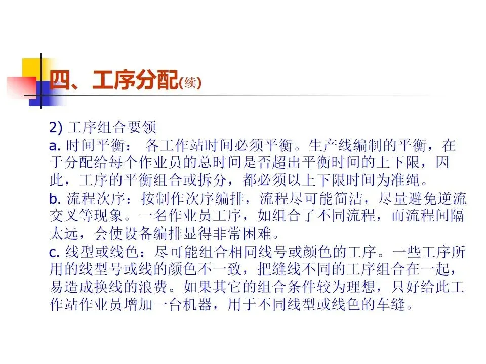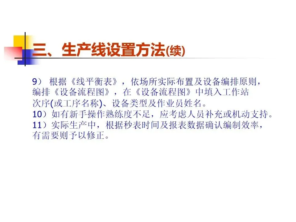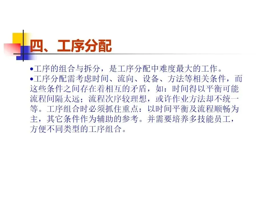 本文围绕生产线节拍(TAKT)的概念及其在生产管理中的应用展开系统阐述,明确了节拍作为平衡生产线节奏的核心工具,旨在通过精确设定生产步调和合理分配工序,实现按时按量生产。内容涵盖了生产线设置的原则与方法,强调从方便管理、质量控制、生产平衡、流水顺畅等多个维度出发,科学构建生产线。通过工序分配、设备布置和线平衡表的制定,确保各工作站时间均衡、流程顺畅。同时,针对生产过程中可能出现的瓶颈问题,提出了多种改善方法,如作业分割、设备改良、方法优化、技能提升等,强调改善的持续性和系统性,而非简单的人员增补。整体而言,该内容为提升生产线效率、优化资源配置、实现精益生产提供了系统的理论指导和实操路径。